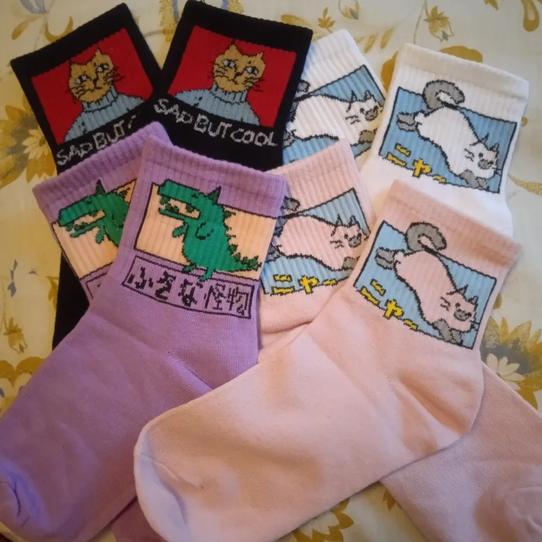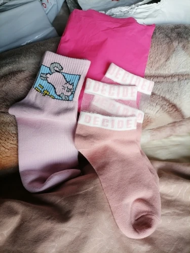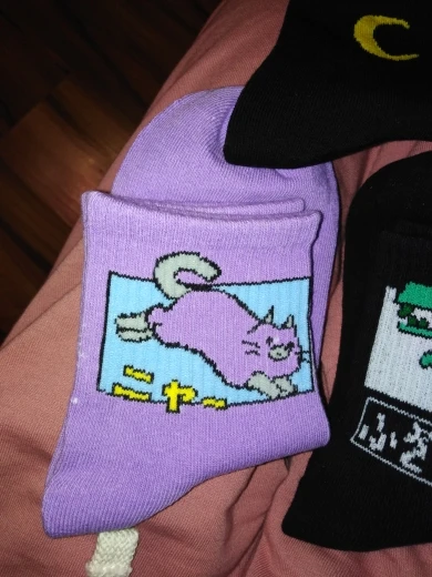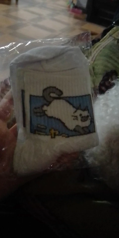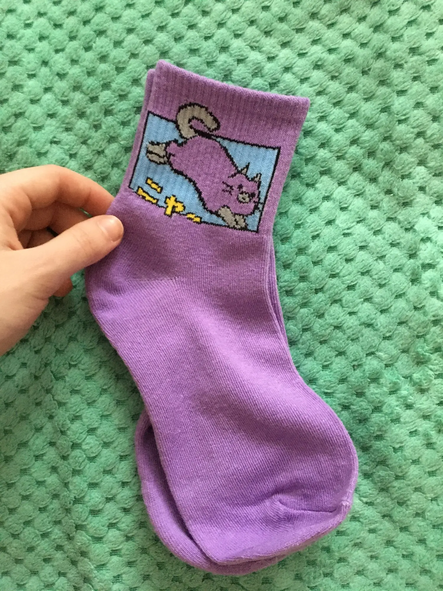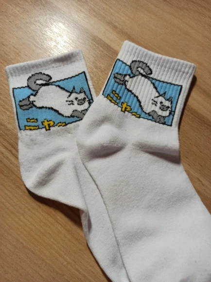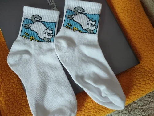 Честно говоря, изначально предвзято относилась к тому, чтобы заказывать что-то на Али (даже носки), но сейчас поменяла свое мнение. Носки действительно хорошие, качественные, рисунок вышит с внутренней стороны, цвета и сам рисунок яркие, нитки нигде не торчат. Шли около двух недель до Питера. Единственное, к чему можно немного придраться: носки не 100% хлопок, из-за чего нога будет сильнее потеть + рисунок котика, поскольку достаточно большой, сильно растягивается на ноге, из-за чего становятся видны белые нитки внутри. В остальном нареканий нет. Отличный товар!