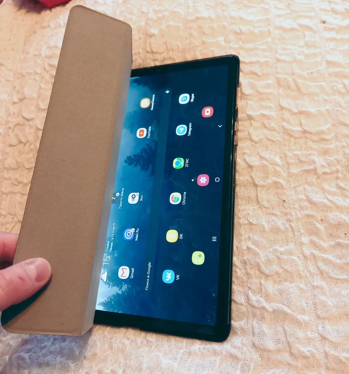 Описание совпадает. Брал чехол для планшета Samsung Galaxy Tab S5e 2019. Подошел идеально. Выглядит отлично. Думал, будет хуже. Открываешь планшет - включается экран. Планшет устойчиво стоит на столе в обоих положениях. Кнопку включения теперь немного легче найти. Доставили за 2.5 недель, что нормально для доставки в Томск.