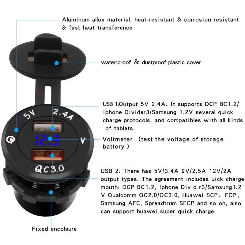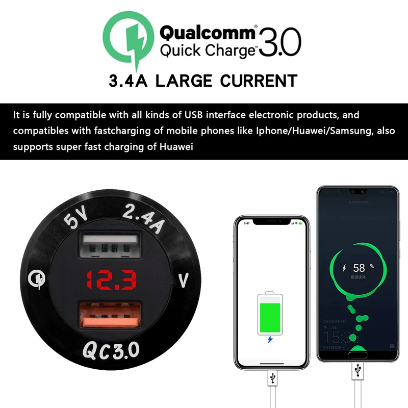 Товар включает в себя: 1x QC 3,0 двойной USB разъем крепление Автомобильный Адаптер зарядного устройства для телефона 5В 3.4A 2x изолированные клеммы