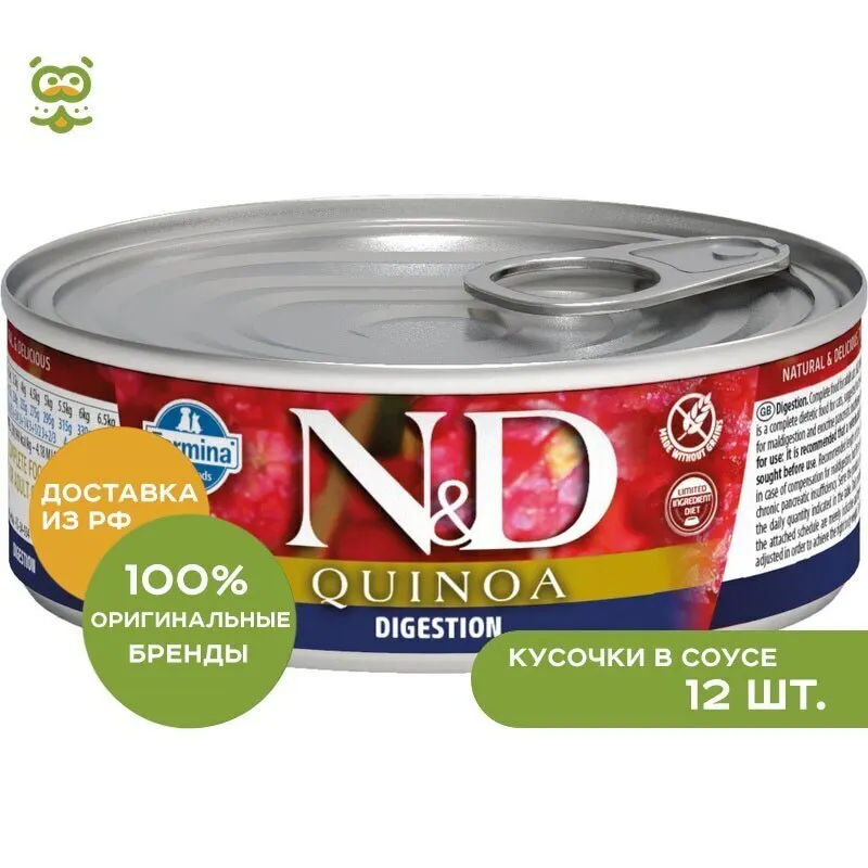N&D Quinoa Digestion - диетический полнорационный влажный корм для кошек, рекомендуемый при нарушениях переваривания пищи и при экзокринной недостаточности поджелудочной железы.