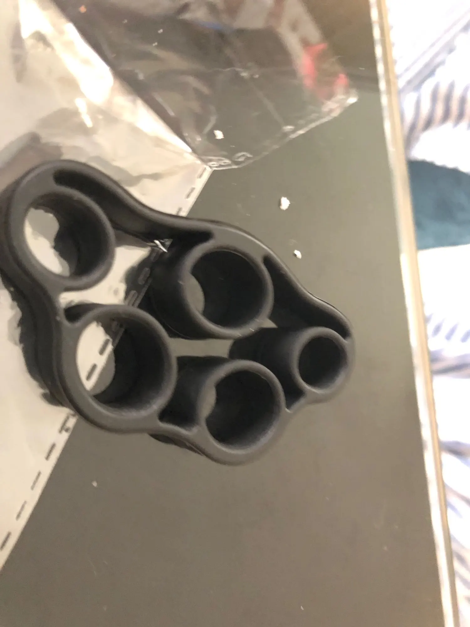 Качество оставляет желать лучшего, крайне не эргономично (пальцы еле пролазят) между указательным и большим пальцем весьма слабый состав, как только дать ему нагрузку цвет резины становится белым на грани разрыва