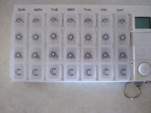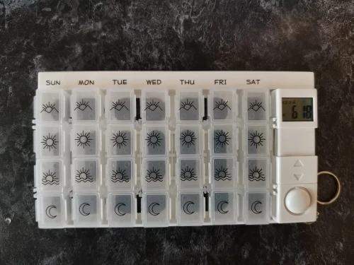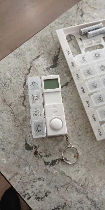 После получения, я понял, что не требуется брать с собой всю неделю каждый день. Это позволяет просто прикрепить колонку будильника к колонне на один день, стоящей за лекарствами и