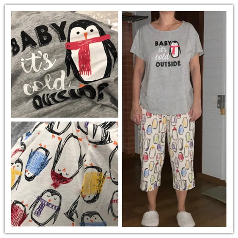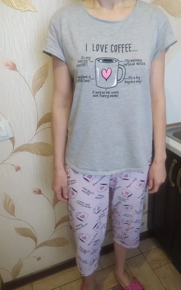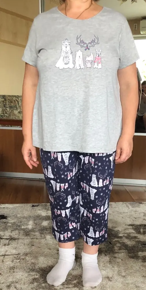 Не усмотрела, что штаны не длинные, а три четверти. Где-то до середины икры, это немного огорчило. Но в целом - очень неплохая пижама, мне нравится. Посмотрим что будет после стирки. Очень мило, что положили носки в подарок, спасибо! И очень быстрая доставка - в Московской области посылка была через 2 недели после заказа. Ещё раз спасибо продавцу!