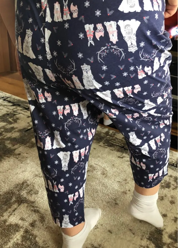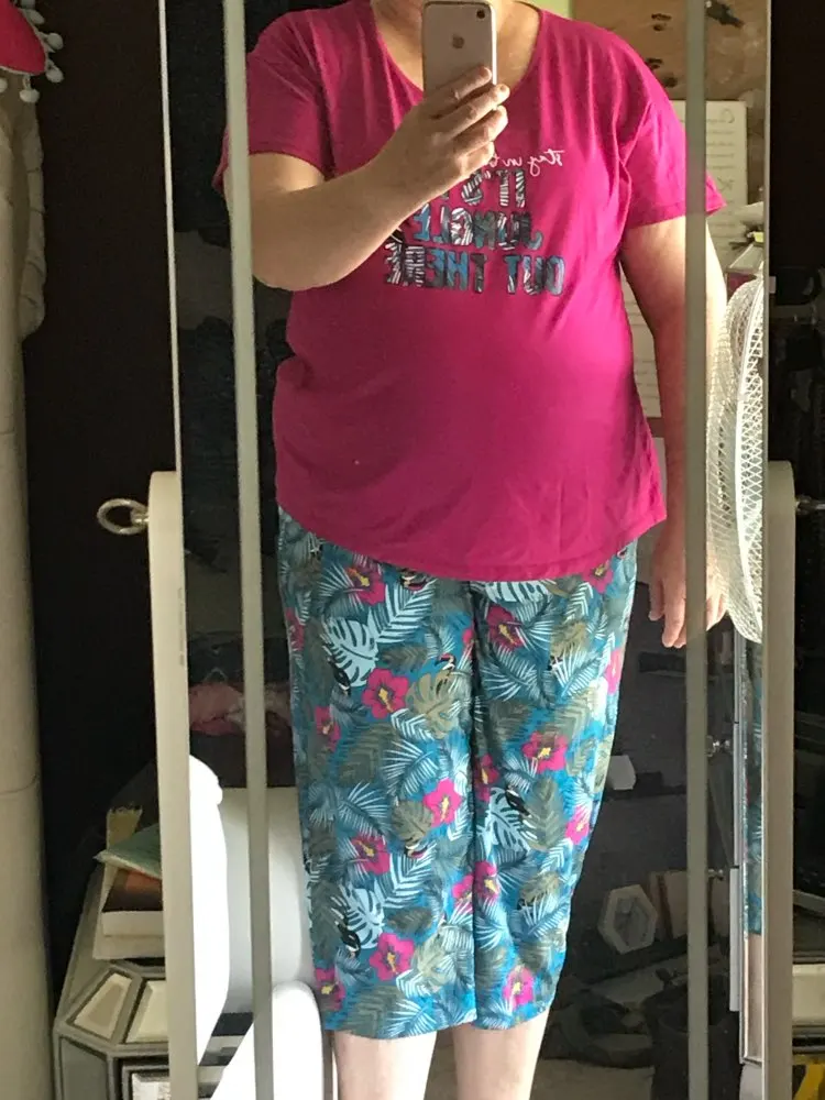 Пижама с бриджами, а не длинными штанами. Для дам А силуэта маленького роста, верх р.60, а бриджи вероятно для беременных р.70+.