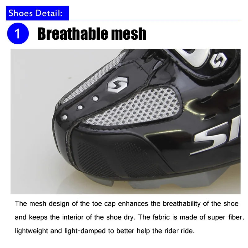 Сетчатый Дизайн носка улучшает воздухопроницаемость обуви и сохраняет интерьер обуви сухими. Эта модель выполнена из высококачественного материала из однопарная, светильник вес и светильник-амортизационный для того, чтобы лучше помочь всадника езды.