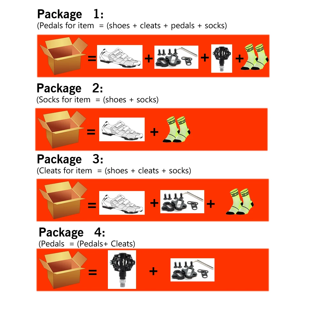 (Мы не отправляем обувные коробки старательно быстрее, разные упаковки имеют разные комбинации продуктов)Посылка 1:ПедалиДля SD001 = (обувь + бутсы + педали + носки)Посылка 2:НоскиДля SD001 = (обувь + носки)Посылка 3:БутсыДля SD001 = (обувь + бутсы + носки)