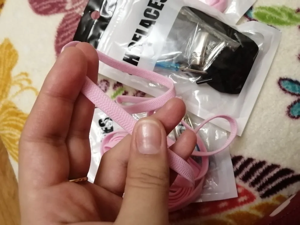 Шнурки эластичные, как резинка. Длины хватило на невысокие кроссовки. Застежку посадила на момент-гель и болтик, который шёл в комплекте. В комплект, кстати входило: 2 шнурка, 2 застежки, 12 болтиков без шляпки, крошечная отвертка. Пришло за месяц. Отслеживалась.