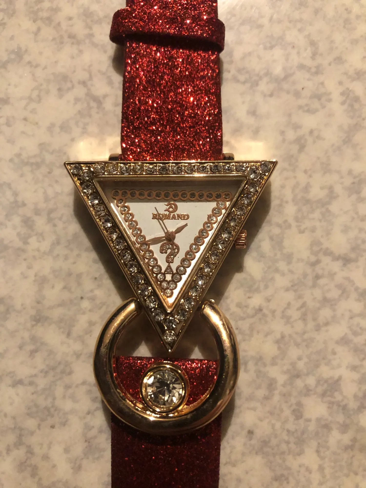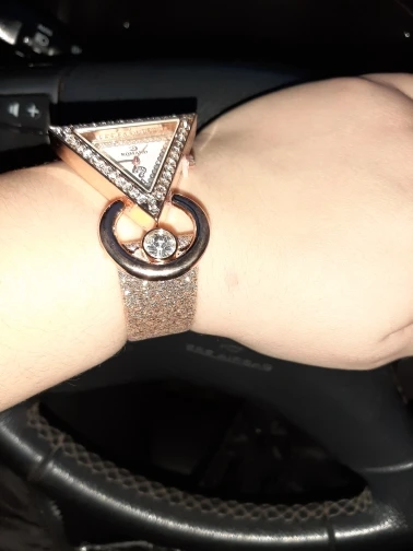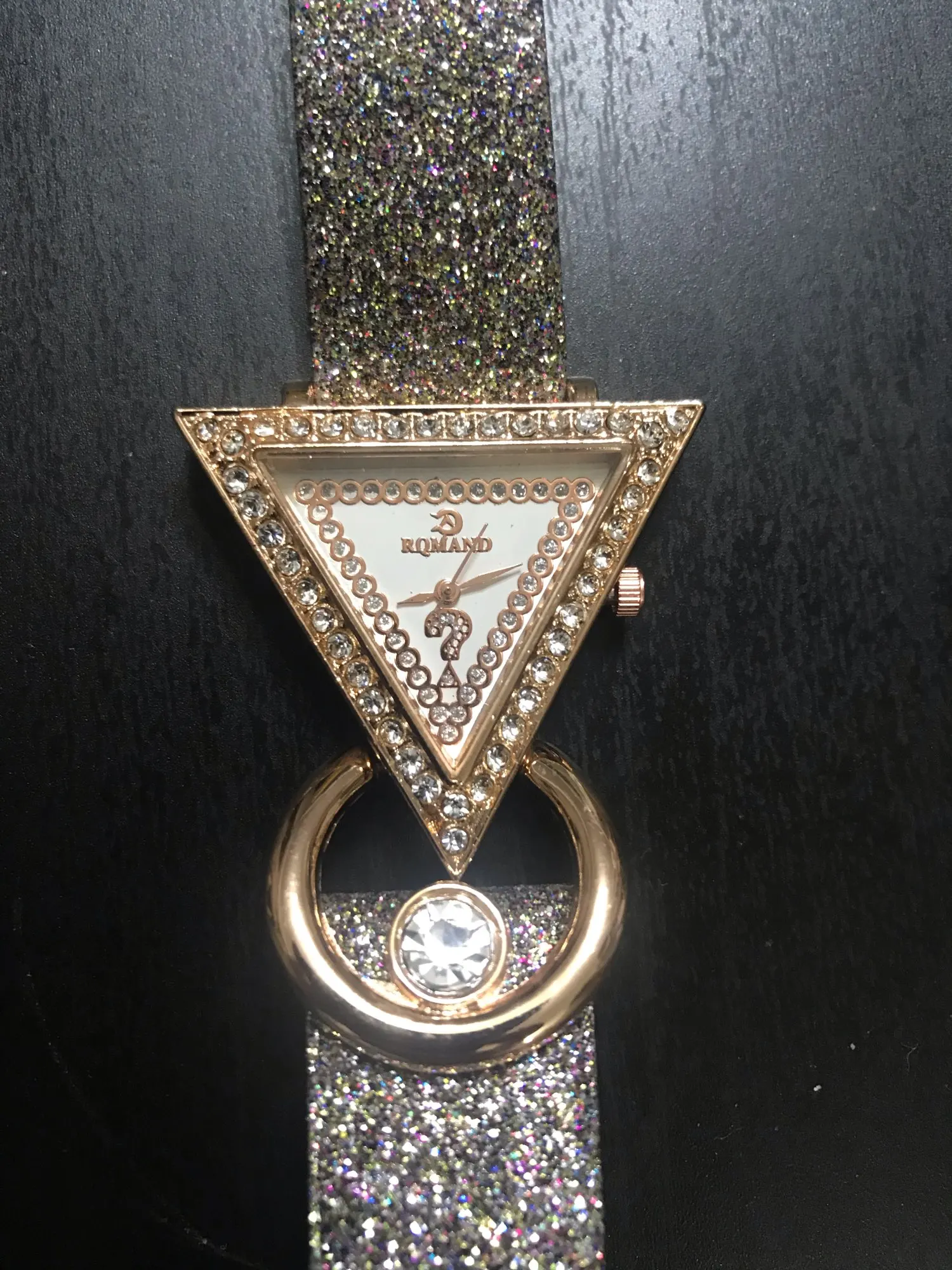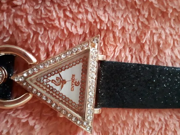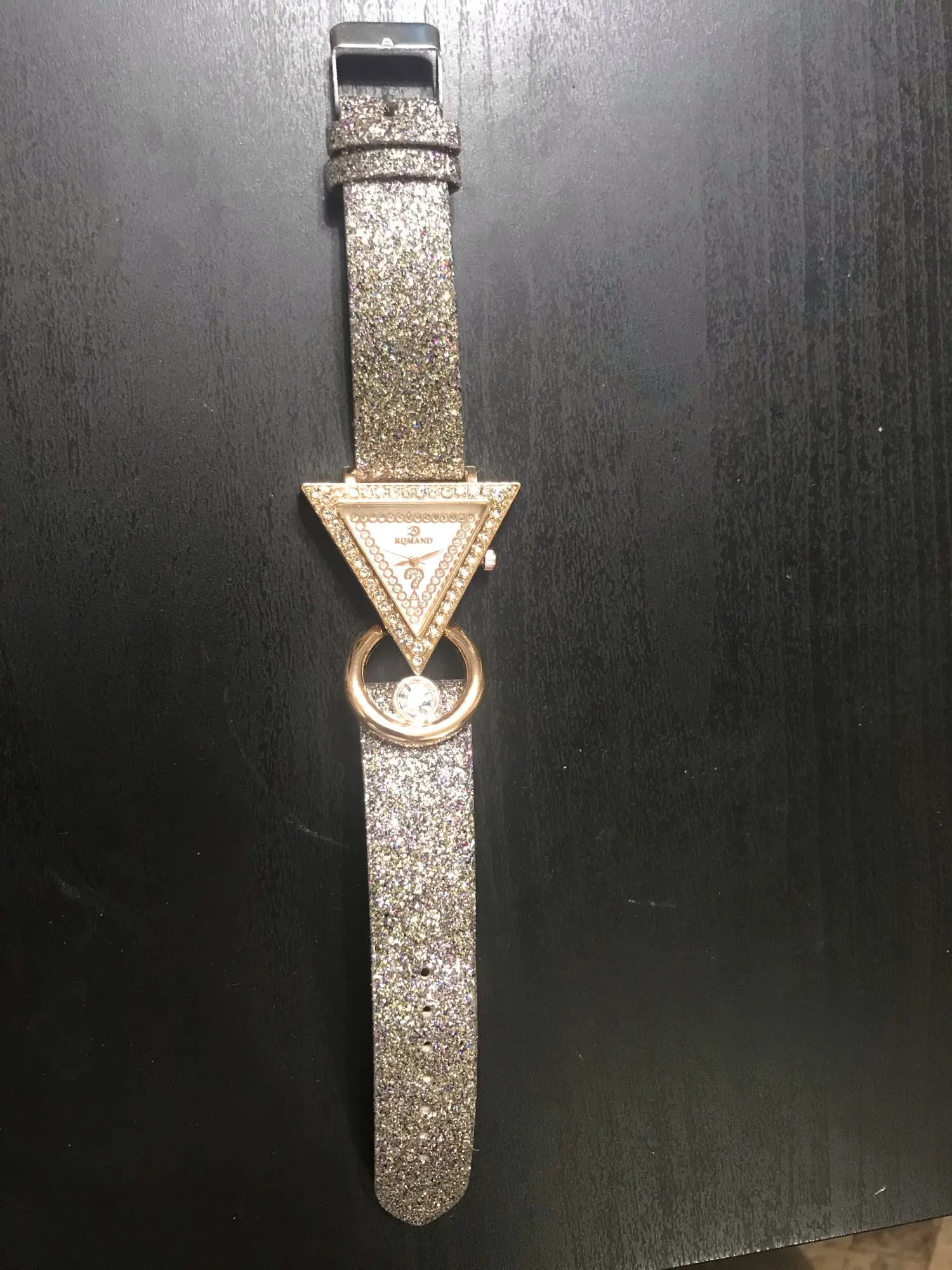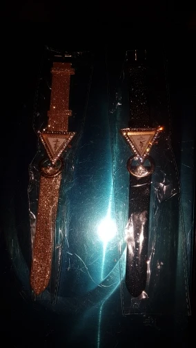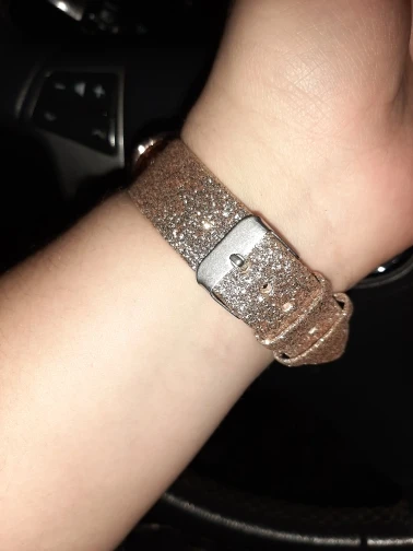 Very attractive, unique watch. I was pleasantly surprised to see that the band was also sparkled. The only problem was the pin linking the band to the watch fell out immediately and almost seems too small. I was able to replace it, but will probably end up gluing in place just to be sure that it doesn't fall out again.