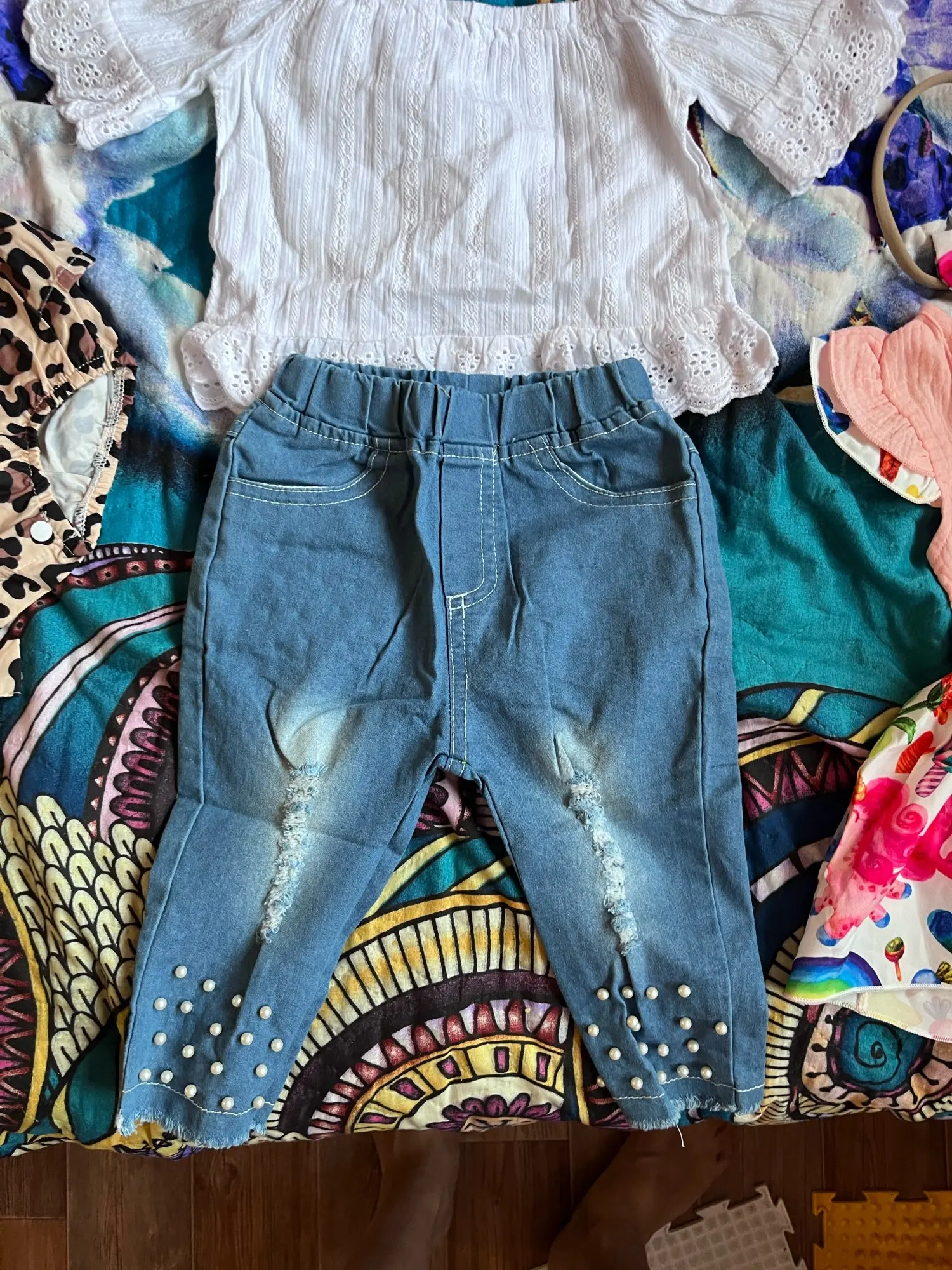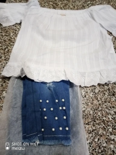 2019, Детская летняя одежда, яркие детские белые топы с открытыми плечами для маленьких девочек, футболка, джинсовые длинные брюки с жемчугом, джинсовый комплект одежды