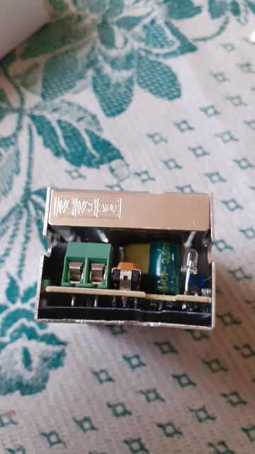 Все как в описании. Есть потенциометр, видимо для подстройки напряжения. Пока не крутил. Для крепления есть отверстия на нижней и боковой гранях с дырками для отвертки на противоположных. На входе и выходе клемники. На входе с землей. Плата подвешена в корпусе на выприсованных зажимах на одной :) втулке. но стоит крепко. Под платой пленочная толстая подкладка, хотя и большой воздушный зазор. В общем сделано все аккуратно и культурно. Только не привычно не пластиковая коробочка а минипром БП. Буду еще брать, если по характеристикам все ок будет.