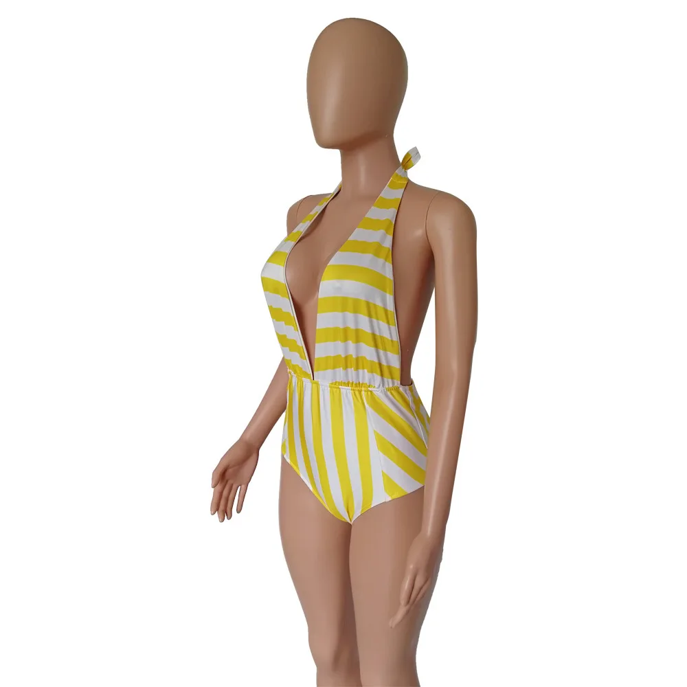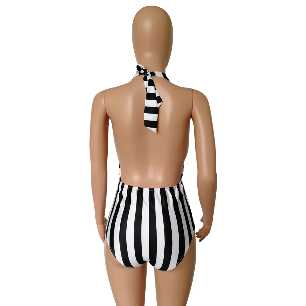 Сексуальный цельный купальник для женщин, Холтер с глубоким v-образным вырезом, белый, черный, в полоску, Цельный купальник, боди с высоким вырезом, пуш-ап, пляжная одежда