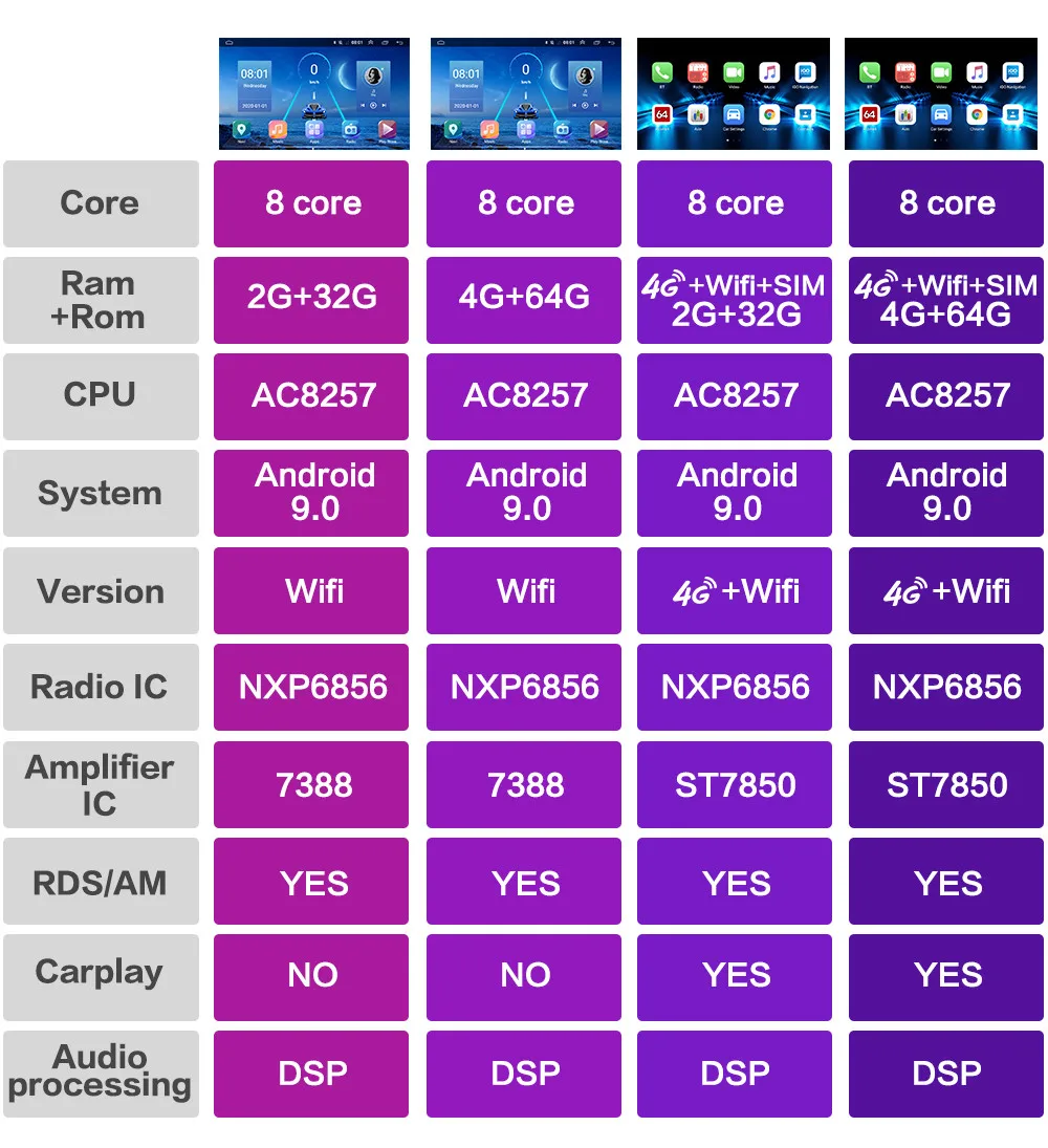 Для Hyundai Creta IX25 2015 2016 2017 2018 2019 2020 1, 4-ядерная конфигурация включает (RAM + ROM): 1G + 16G / 2G + 16G / 2G + 32G / 4G-SIM-3560-2G + 32G [опционально]; 2, 8-ядерная конфигурация включает (RAM + ROM): 7260L-2G + 32G / 7260L-4G + 64G / 4G-SIM-5760-2G + 32G / 4G-SIM-5760-4G + 64G / 4G-SIM-TS10-4G + 64G / 4G-SIM-TS10-6G + 128G [опционально]; 3, 4-ядерный содержит: версию: Android 8,1; Четырехъядерный процессор MTK8227 / Cortex-A7 Поддержка логотипа автомобиля 5; Заводской пароль: 8888 Разрешение: HD 2.5D,1024*600; Не поддерживает функцию AM, RDS; Обыпосылка пакет версии Wi-Fi поддерживает функцию вывода видео; Версия 3560-4G-SIM-WiFi: версия: Android 6,0; Поддерживает DSP; Не поддерживает функцию вывода видео; 4, 8-ядерный содержит: версию: Android 9,0 или Android 10; Восемь ядер: CPU Quad core и GPU Quad core соответственно; Поддержка логотипа автомобиля 5; Пароль завода: 8888; Разрешение: HD 2.5D,1024*600; Версия 7260L-WIFI: поддерживает функции DSP; Не поддерживает выход видео; Версия 4G-SIM-5760-WIFI и 4G-SIM-TS10-WIFI: поддерживает функции DSP, Carplay, разделения экрана; Не поддерживает видеовыход; 5. Операционная система Android может установить приложение Google Play store Skype Facebook youTube Twitter и т. д.; 6. Поддержка: радиостанции, звонков по Bluetooth, музыки по Bluetooth, управления рулевым колесом, встроенного Wi-Fi, MP3, видео-музыки (MPG, AVI), навигации, видеовыхода, зеркальной связи, USB 4G LTE Wi-Fi ключ и другие функции; Поддержка OBD (опционально) Поддержка DAB + (опционально)