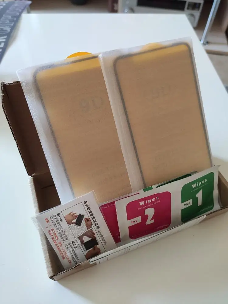 Заказал стёкла 29 августа, а в Караганду они приехали 17 сентября. Полтора месяца - это немного долго, некоторые из моих заказов, сделанных на ту же дату, приехали через три недели. Трек я видел по всему пути, хотя и была задержка в пути на пару недель. Упаковка - картонная коробка без стандартного конверта, повреждений не было, слава КазПочте. Теперь о товаре. Стёкла целые, упакованы в мягкие полимерные конверты, защитное покрытие есть только с клеевой стороны. Всех предметов по две штуки: самих стёкол, сухих и спиртовых салфеток, наклеек от пылинок, а вот ампула с клеящей жидкостью была только одна. Руководство по её использованию только на китайском. Стёкла опять на 1-1,5 мм уже экрана, так что их нужно крепить по центру, а не от края.