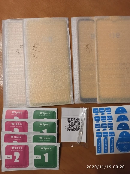 Заказывал 11.11. Получил 07.12. Упаковано в картонную коробку. Все дошло в целости и сохранности. Заказывал 2 стекла на Note 8 pro. В комплекте 2 набора салфеток и стикеров. Клей 1 шт. на 2 стекла.