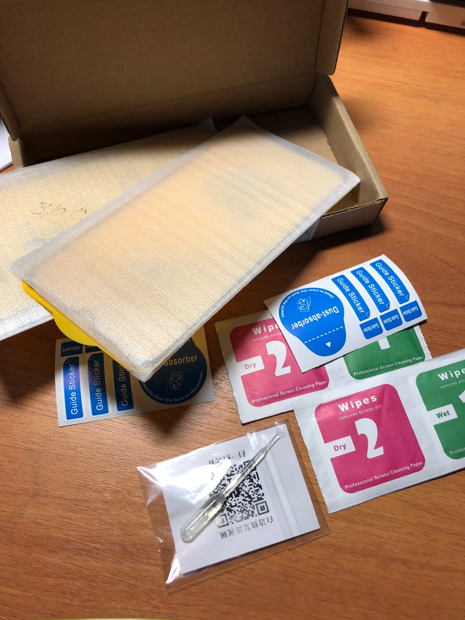 Стекла приехали в картонной коробке, она была помята. Думал стекла упороты! Но они целые. В наборе салфетки, липучки + клей. Обратил внимание, что стекла наклеены на жолтый пластик с воздушными зазорами!!! Поэтому как они наклеяться не знаю, думаю хреново.