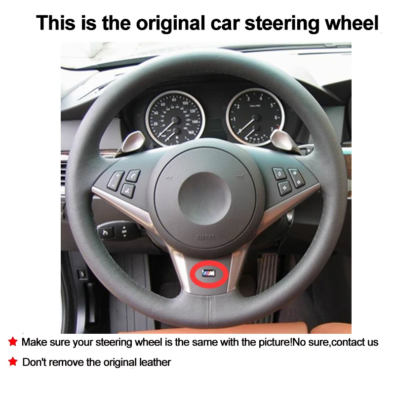 Suitible автомобиля Тип: Для BMW E60 M5 2005-2008 / E63 E64 Cabrio M6 2005-2010 (без выпуклостей на 2 часах и 10 часах положения рулевого колеса) Примечание 1: Не снимайте оригинальную кожу. Пожалуйста, измерьте окружность руля в 2 и 5 часов. Мы можем сделать лучшую крышку для вас. Спасибо!