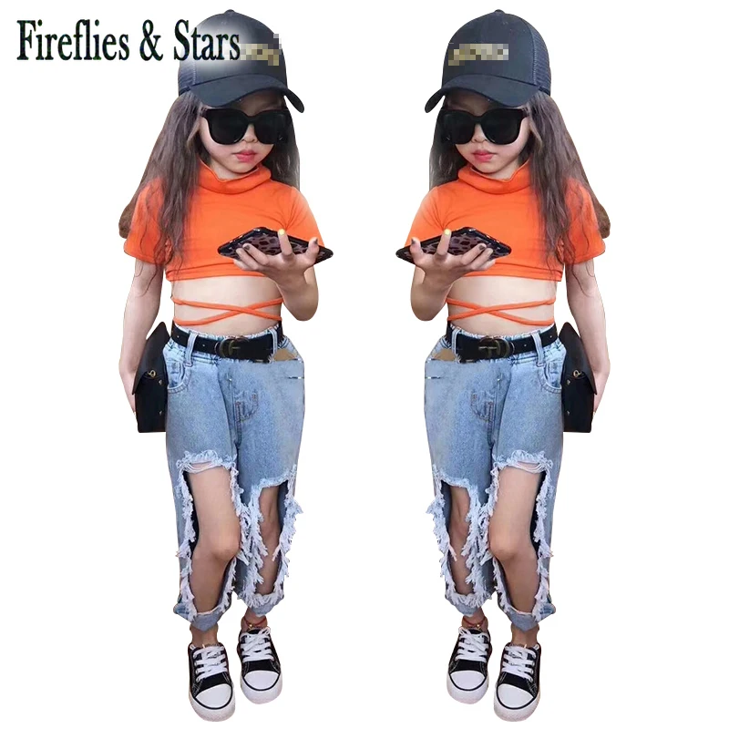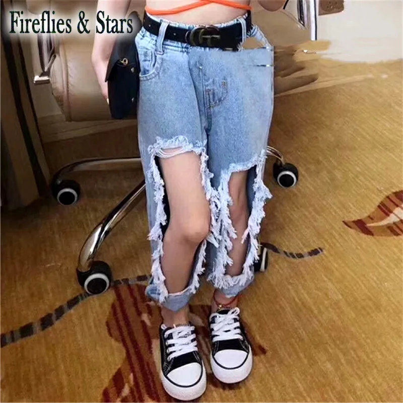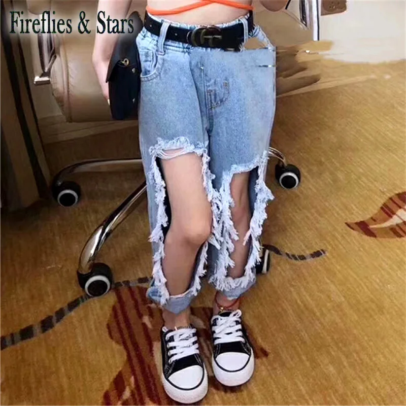 Летние джинсы для девочек, детские джинсовые брюки, детские брюки, модная уличная одежда, рваные до колена, от 2 до 7 лет
