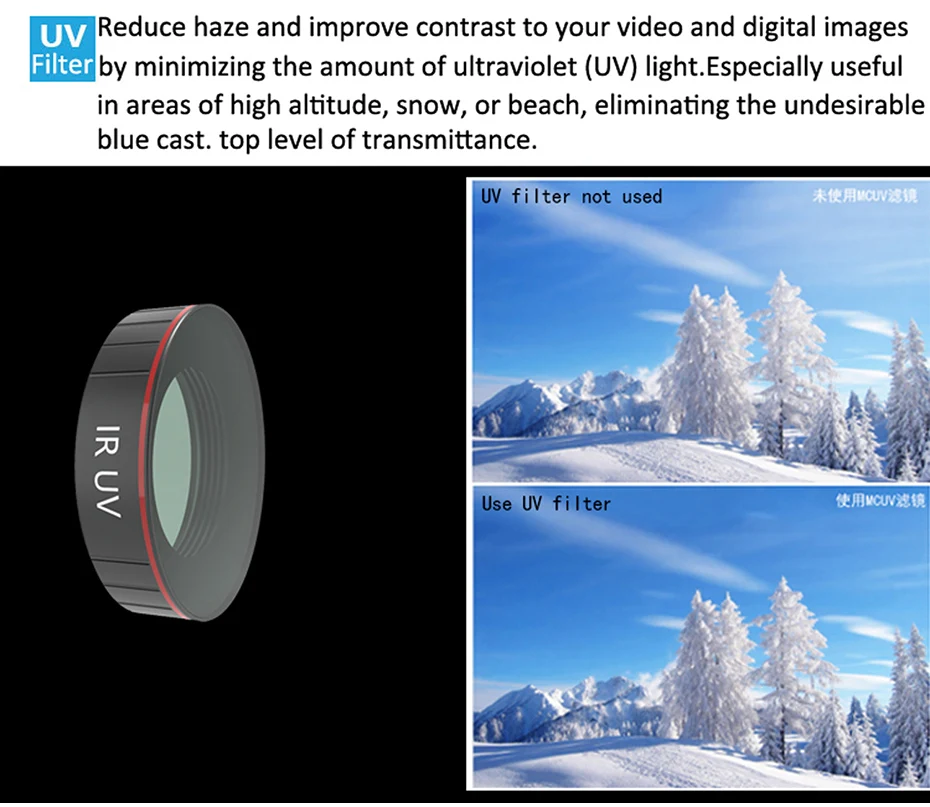 Уменьшить дымку и повысить Контрастность ваших видео и цифровых изображений за счет минимизации количества ультрафиолетового (УФ) света, особенно полезного в областях большой высоты, снега или пляжа, устранение нежелательного синего отлива. Верхний уровень пропускания.
