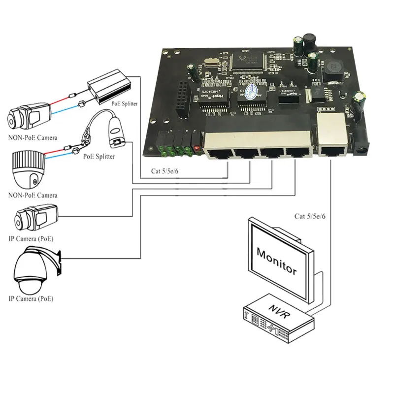 Он обеспечивает соответствие 4 poe портов IEEE802.3af/at с 1 100 Мбит/с rj45 uplink, что позволяет передавать данные с большой пропускной способностью, что очень полезно для HD 200MP, ip-камера 300MP. 1 гигабитный канал связи, подключенный к маршрутизатору/коммутатору, другой гигабитный канал связи, подключенный к NVR.
