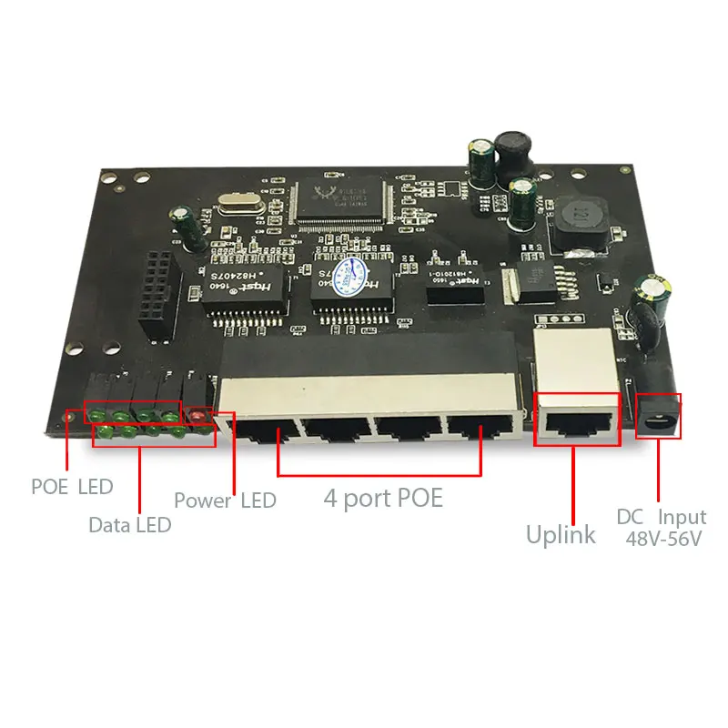 4 порта poe, каждый порт может обеспечить максимальную мощность 30 Вт. Расстояние POE максимум 100 метров через кабели cat 5e/6/7