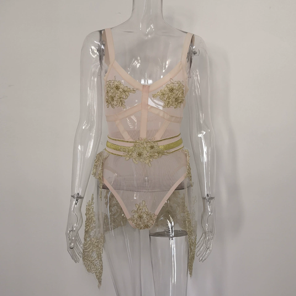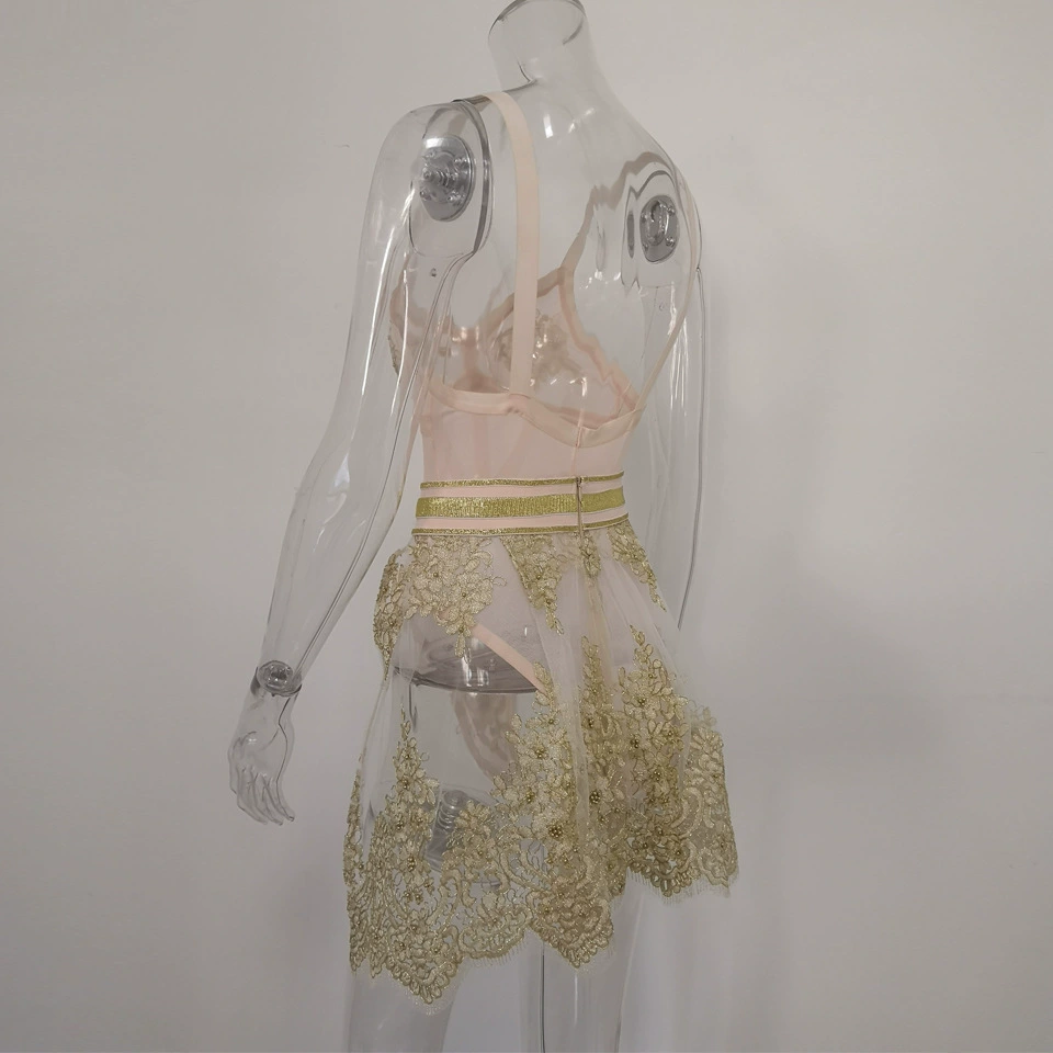 Комплект из двух предметов: боди и мини-юбка золотого цвета с аппликацией, глубоким вырезом и треугольным вырезом