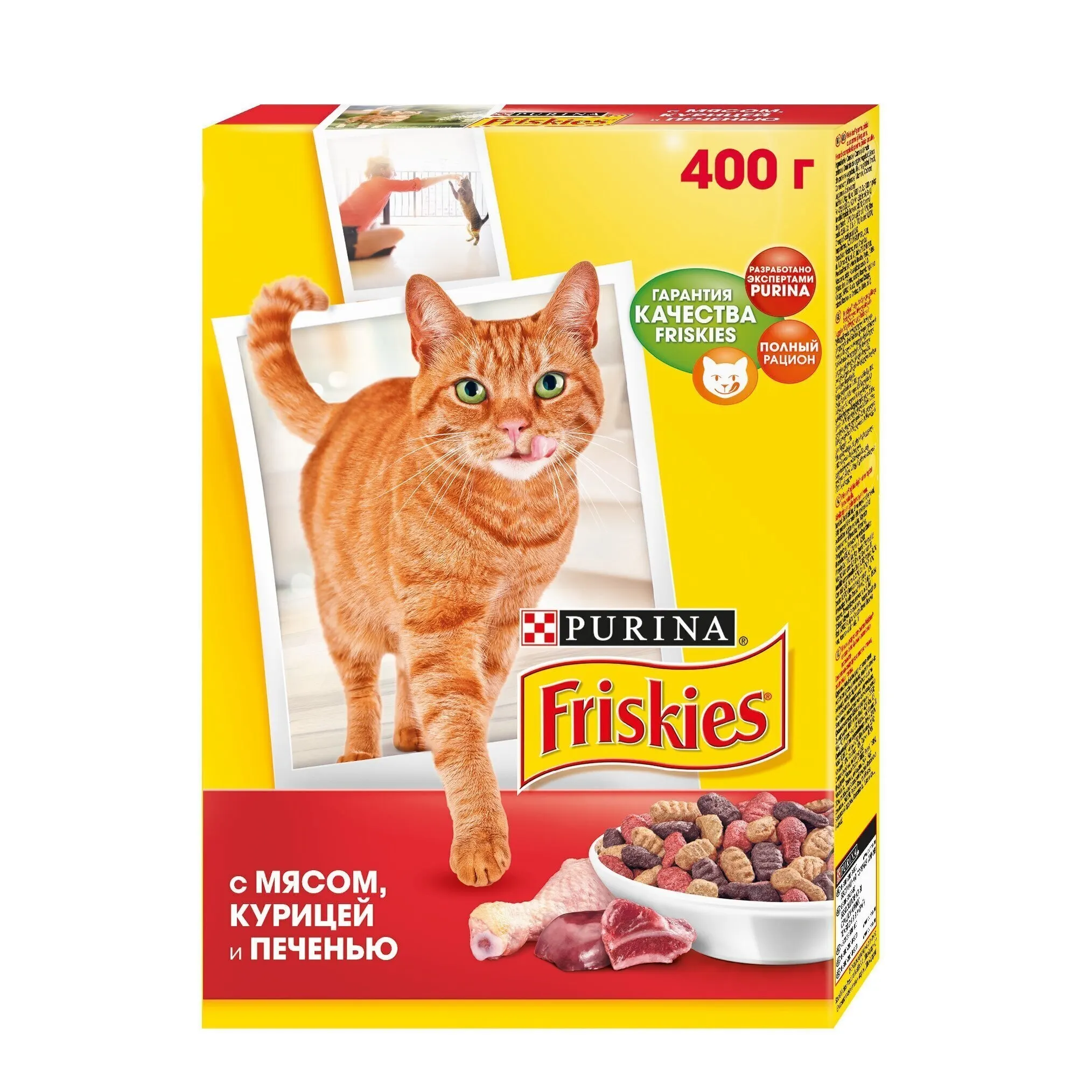 Набор сухой корм Friskies для взрослых кошек с мясом, курицей и печенью, Картонная коробка , 400 г x 10 шт.