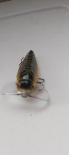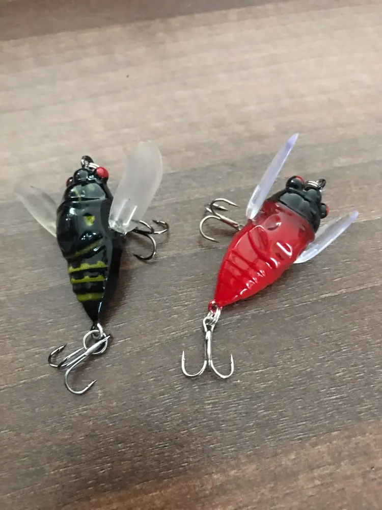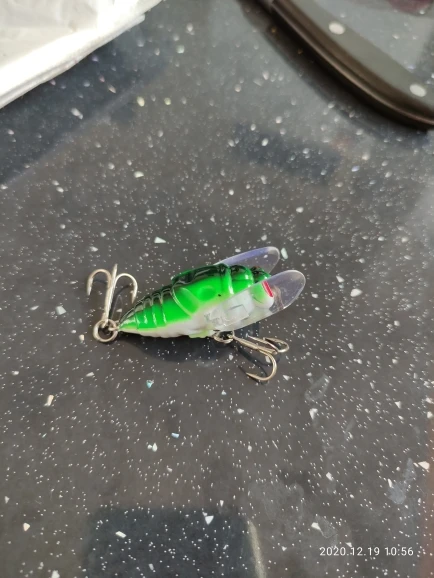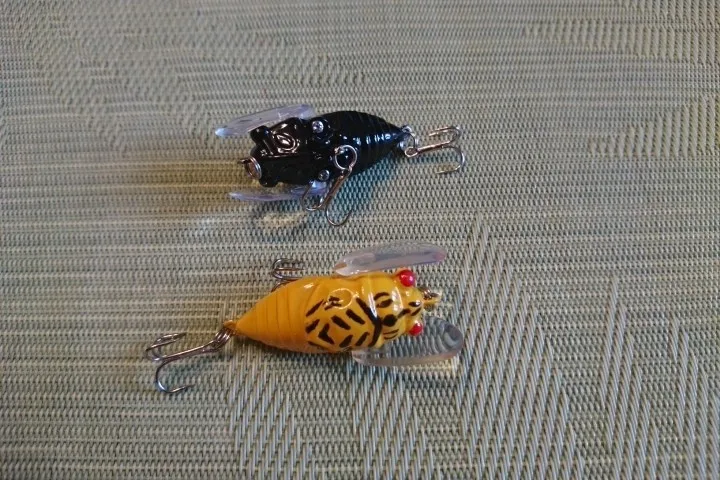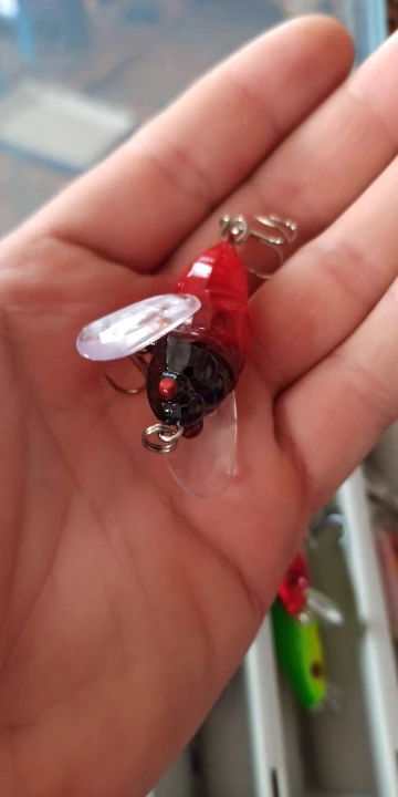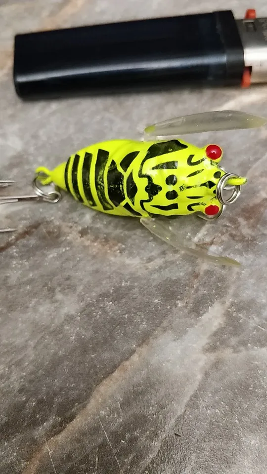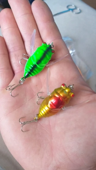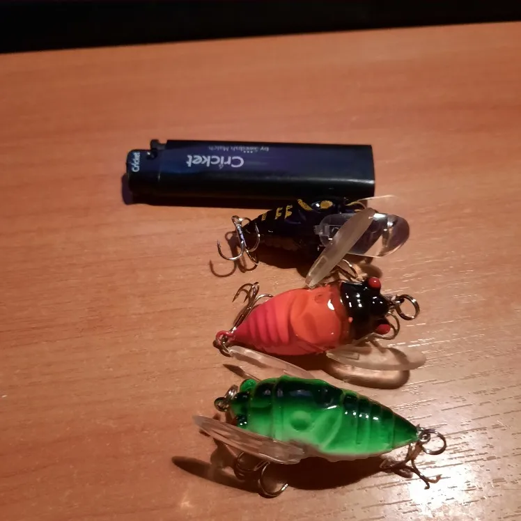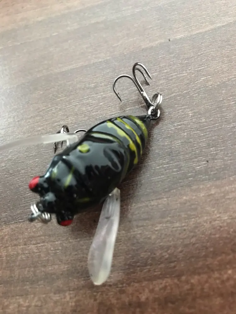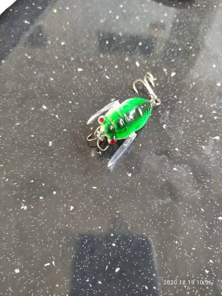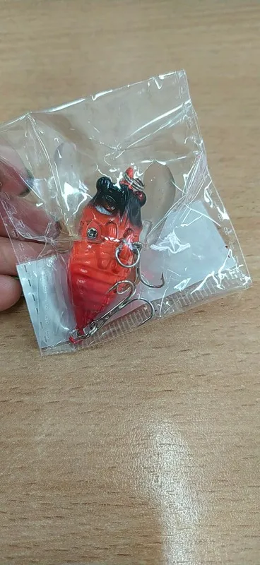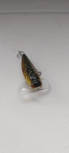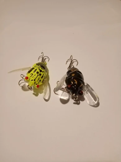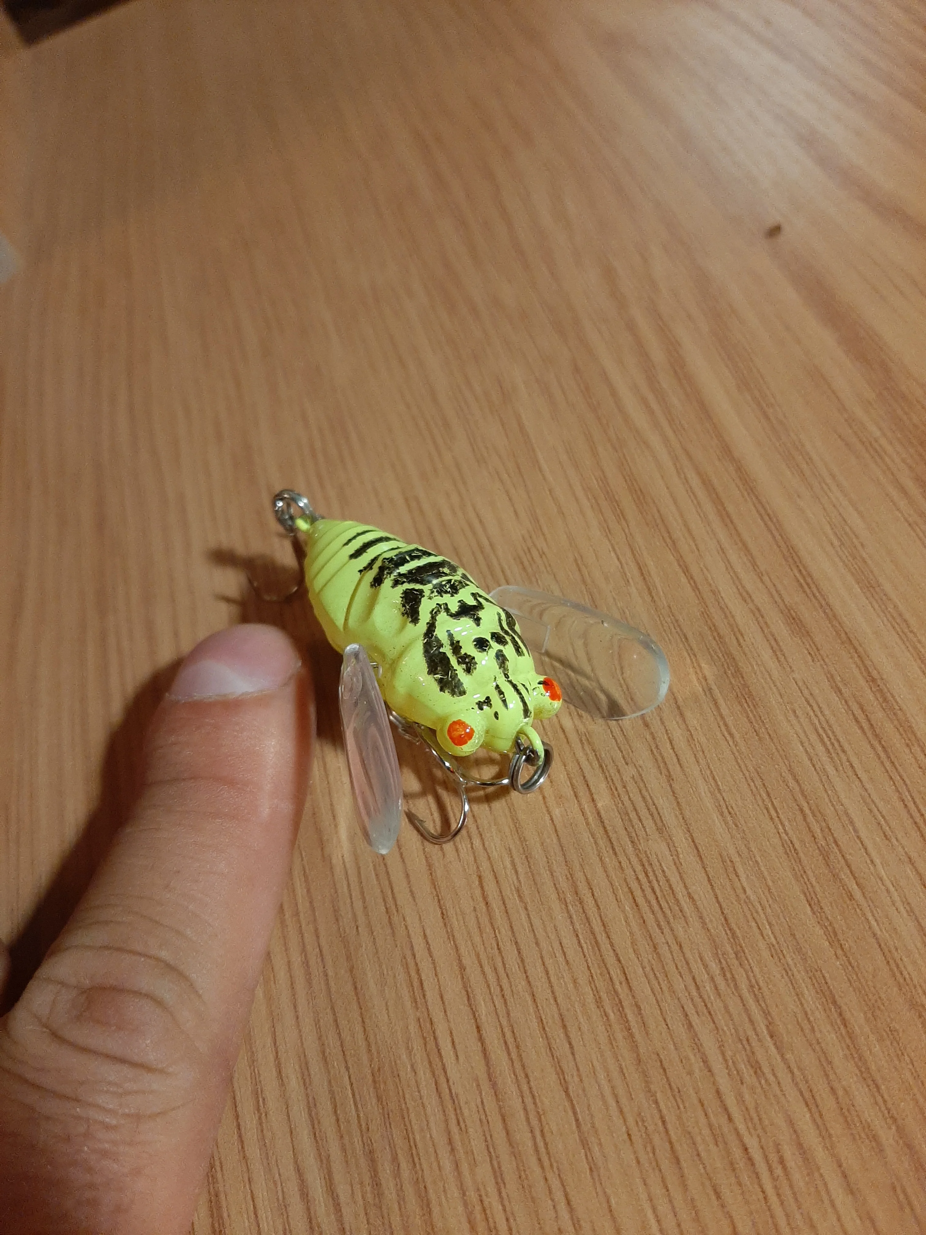 Выглядит интересно, размер небольшой, так что по идее- те только на щуку, может,и на жереха или лосося (чем чёрт не шутит). Боковые лопасти достаточно мягкие, что-то типа резины прозрачной. Размер тройников чуть маловат, но по отношению к размеру самой приманки- вроде нормально. Крюки острые. Единственное, что смущает- учитывая, что приманка поверхностная- все узоры, включая глаза- остаются невидимыми для рыбы, она снизу видит только однотонный корпус цикады. Так что все узоры- для человеков.