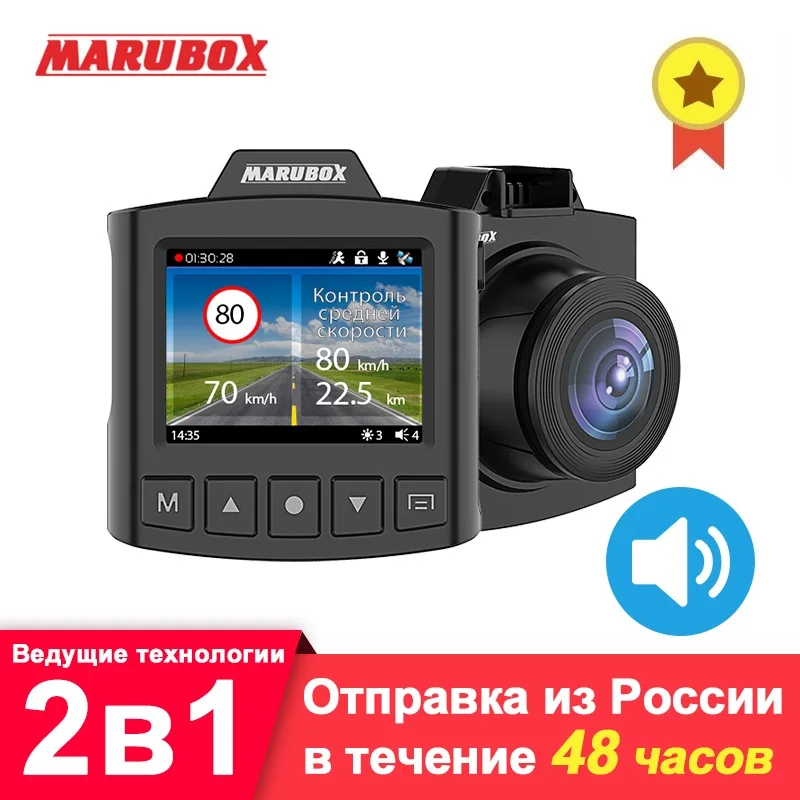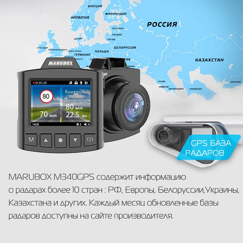 Marubox M340GPS Автомобильный видеорегистратор с GPS информатором, Русские голосовые оповещения, предупреждение водителя о радарах и камерах на дороге, поворотное крепление,содержит информацию о радарах более 10 стран