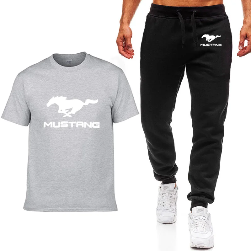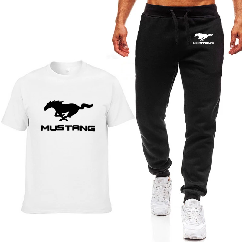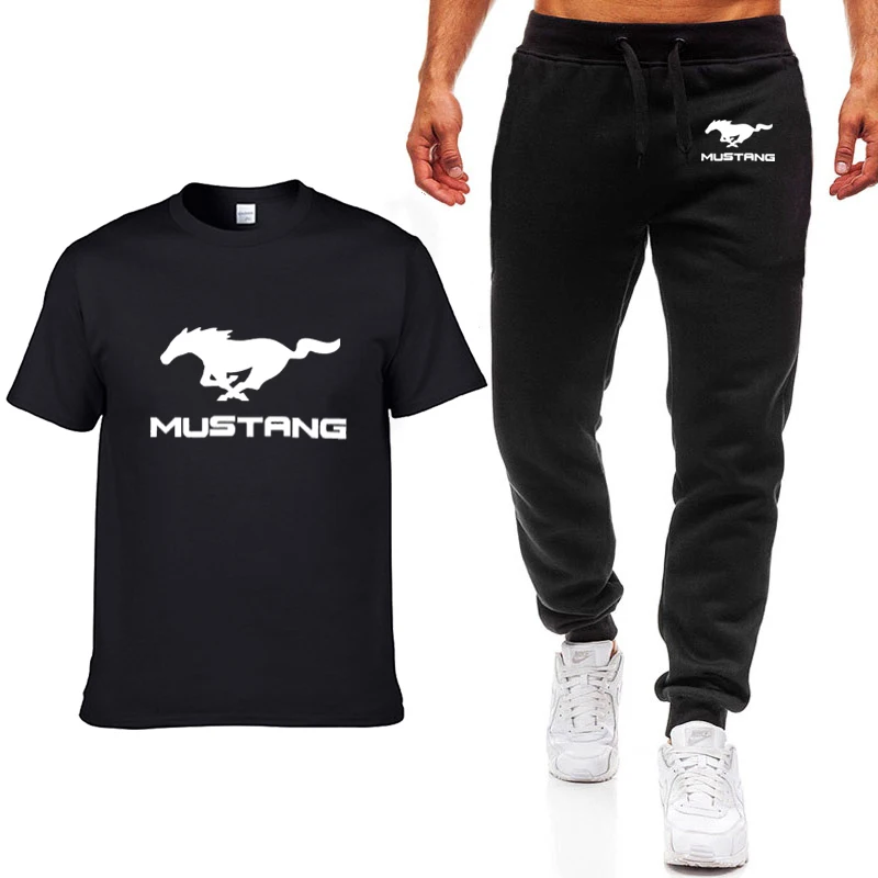 Модные летние мужские футболки Mustang автомобильный брелок с логотипом, с капюшоном в стиле хип-хоп, с принтом, повседневная хлопковая футболка с короткими рукавами весна-осень; Высококачественная футболка + брючной костюм, спортивная одежда