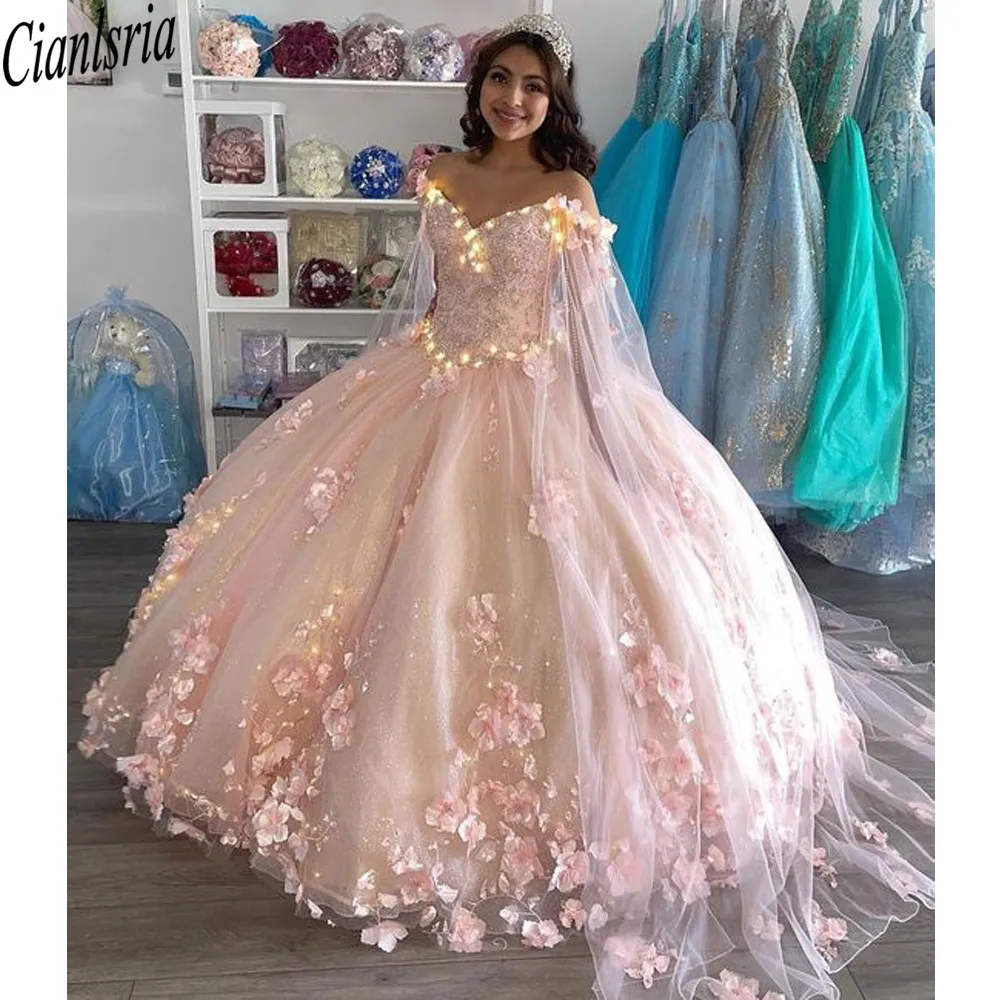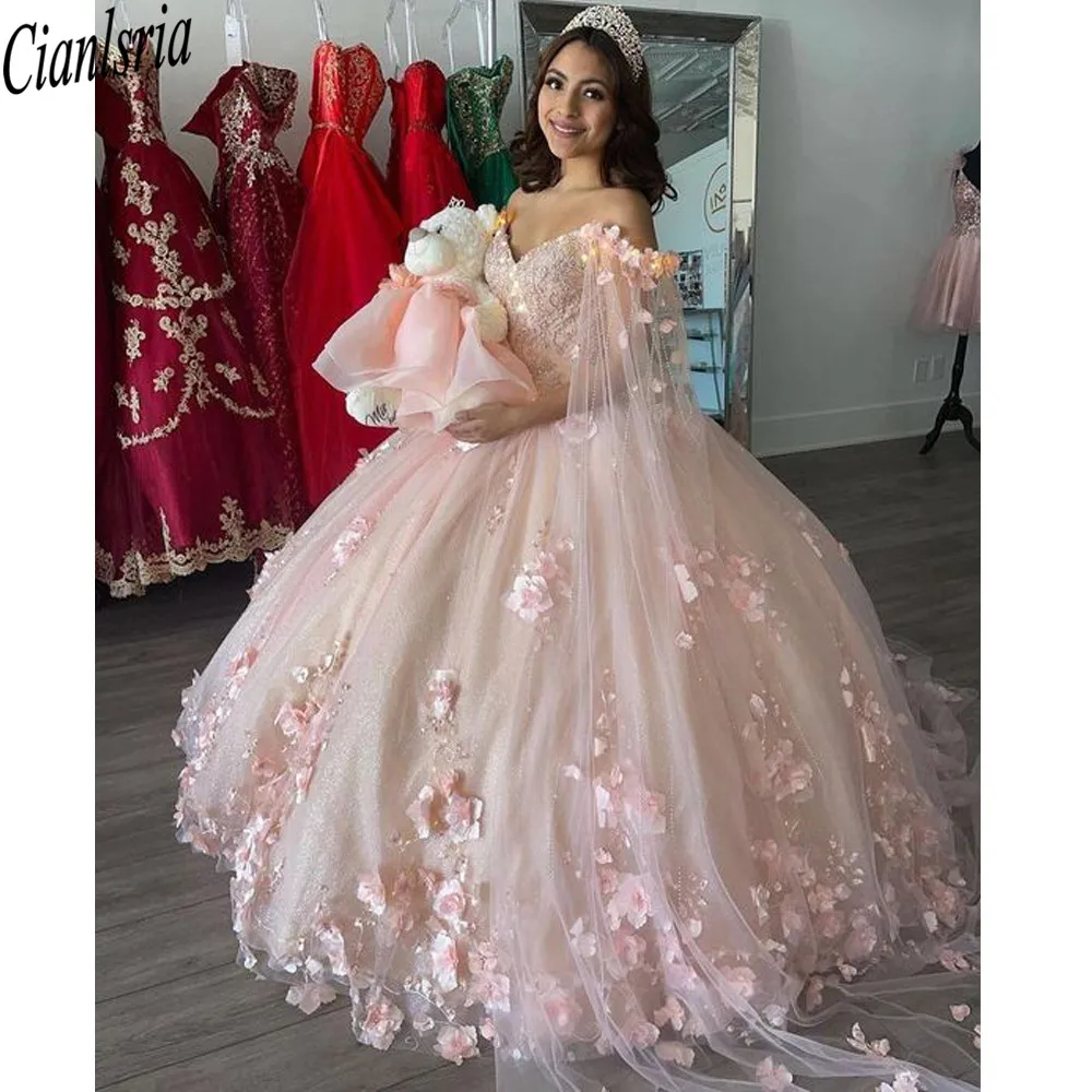Румяна розовые 3D цветочные платья Quinceanera 2021 блестящие тюлев...