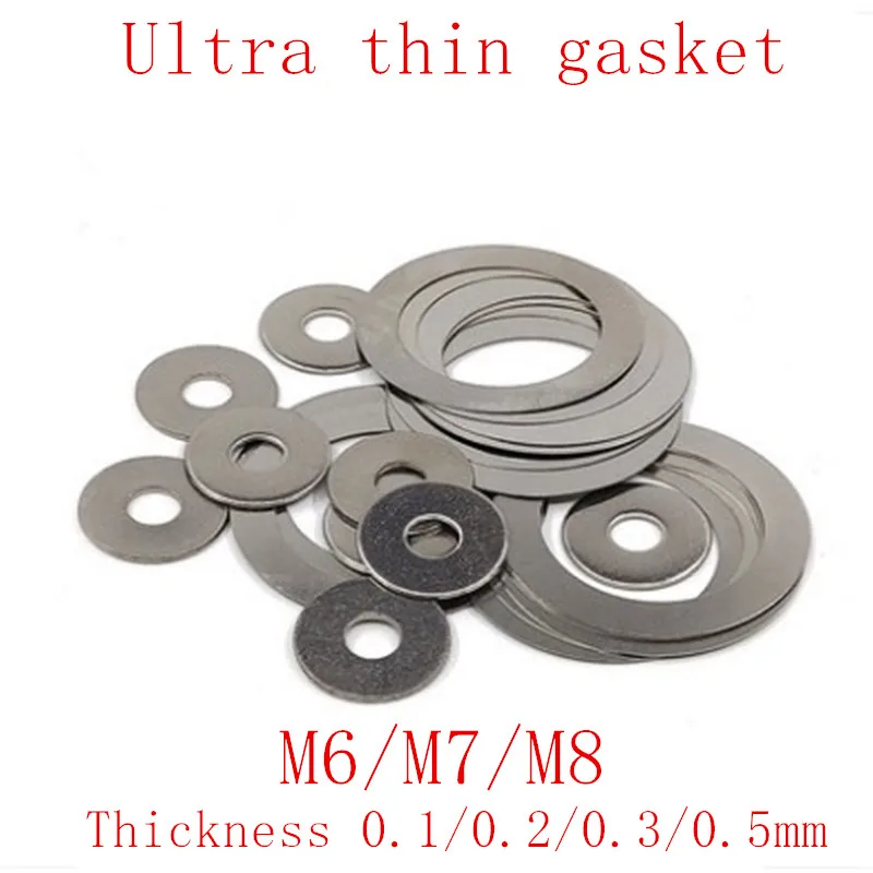 100 шт.лот M6 M7 M8 нержавеющая сталь плоская шайба ультратонких прокладок ультра-тонкий ШИМ Толщина 0,1 0,2 0,3 0,5 1