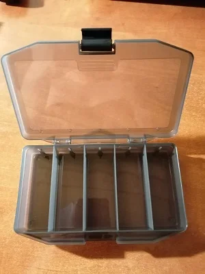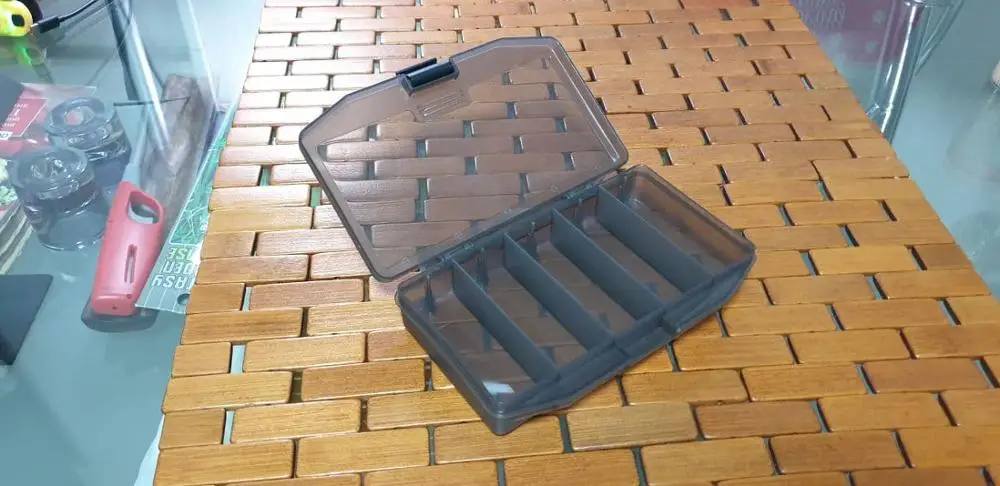 Качественная коробка под блёсны.Пластик не ломучий.Крышка плотно сопрягается с коробкой,без деформаций.Высота и длина коробочки позволяет вмещать советские колебалки среднего размера (Атом,Чудесная,Неман,Протва,Удачная,Отличная,Черноспинка) с приличными тройниками без проблем.