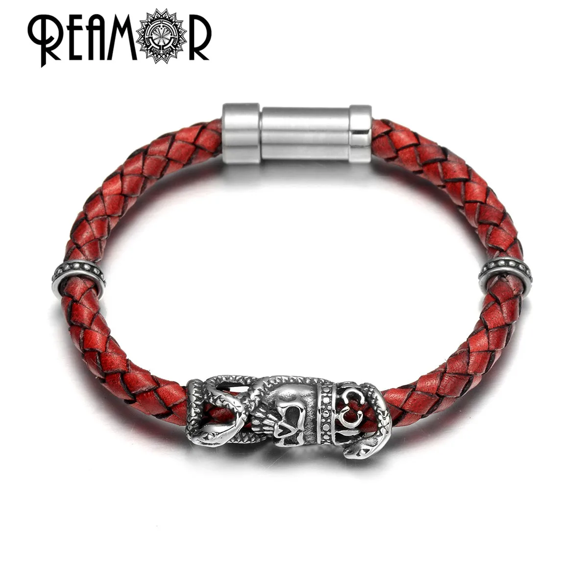 Название: REAMOR панк 316l нержавеющая сталь Дьявол череп змея Ретро красный кожаный плетеный браслет мужские DIY металлические браслеты ручной работы