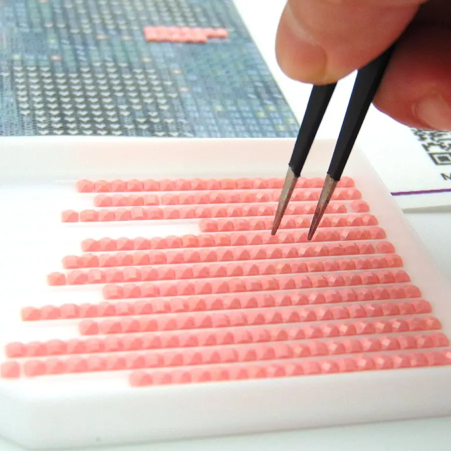 Инструменты в том числе: ручка (различные точки ручки для приклеивания 1, 3 или 6 бриллиантов), алмазная пластина, клей и пинцет