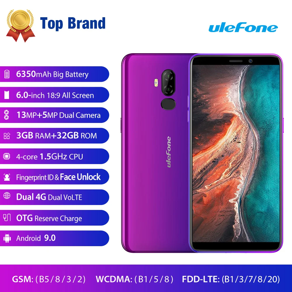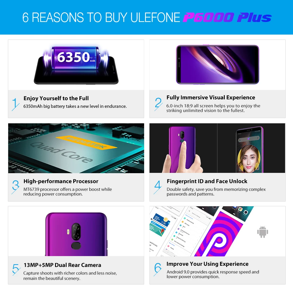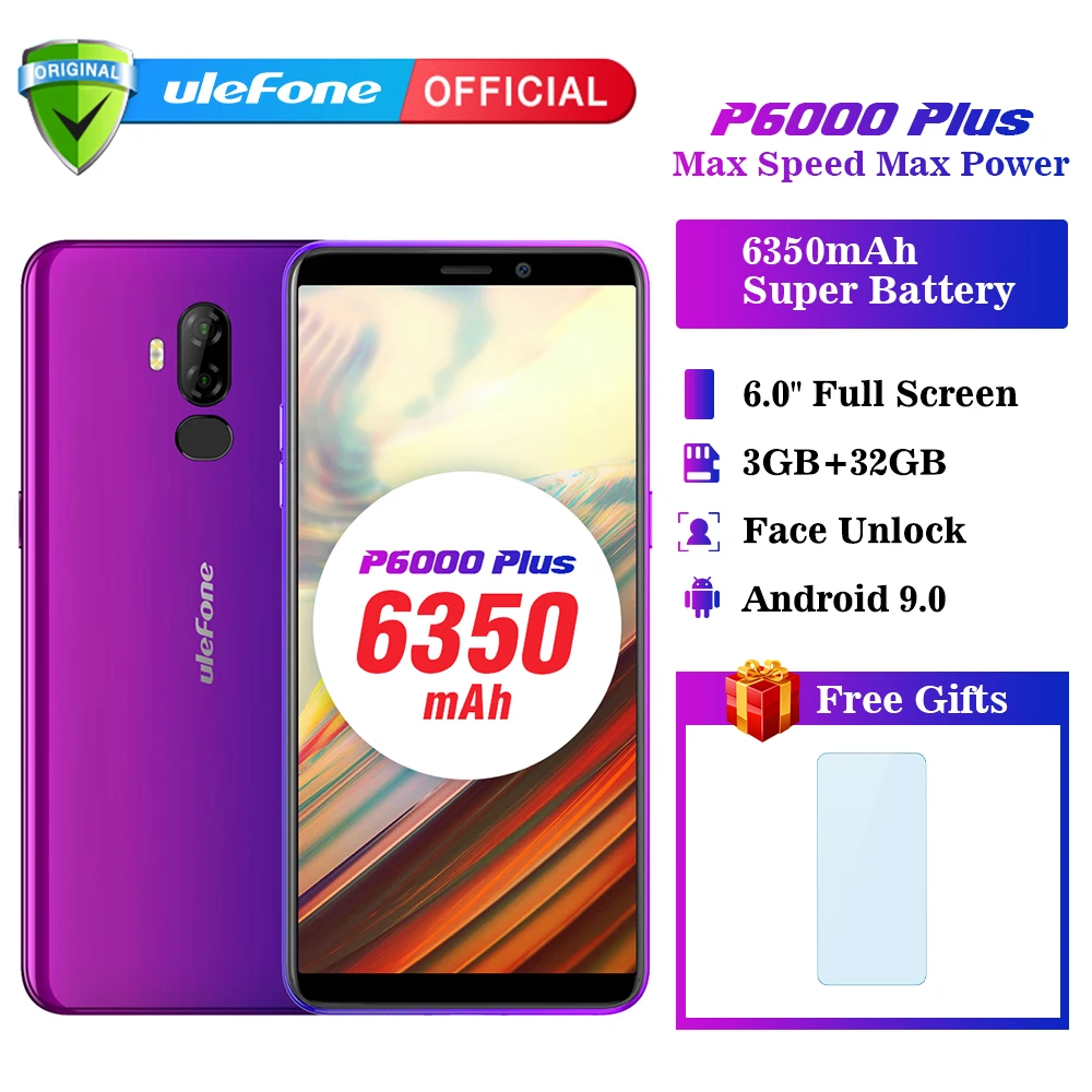 Смартфон Ulefone P6000 Plus, Android 9,0, 6350 мАч, 6,0 дюйма, распознавание лица, HD + Двойная камера, Ouad Core, 3 ГБ, 32 ГБ, Face ID4G LTE