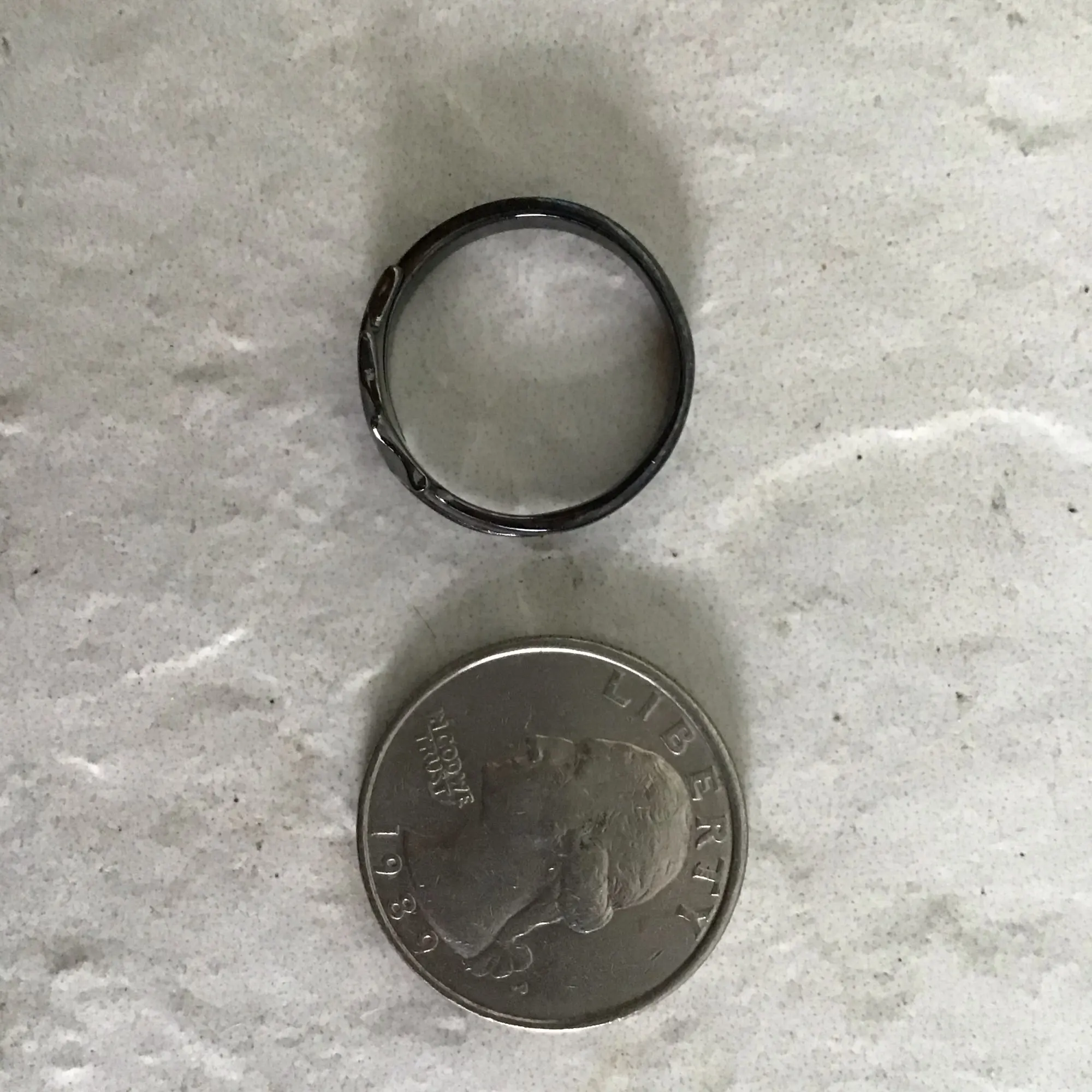 Кольцо красивое. Мне нравится. Легко регулируется, но сохраняет форму. Я немного беспокоюсь о тонкости края крыла, но он кажется достаточно прочным. Было не так темно, как я надевал, больше блестящего темно-серого, а не черного. Это изображение, которое я сравнил с другим черным кольцом. Я носил его уже целый день, и цвет немного скошенный, но не очень заметный. Мне нравится.