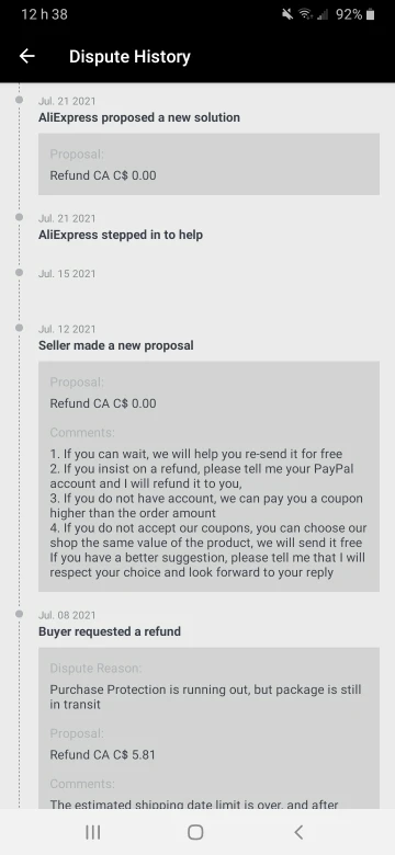 После продления срока защиты клиентов 3 раза, я все еще не удалял посылку. Я открывал спор, но продавец сказал, что ничего не может с этим поделать, и потребовал закрыть спор, предложив вернуть деньги на мой счет Paypal или дать купоны или другие не очень надежные вещи.