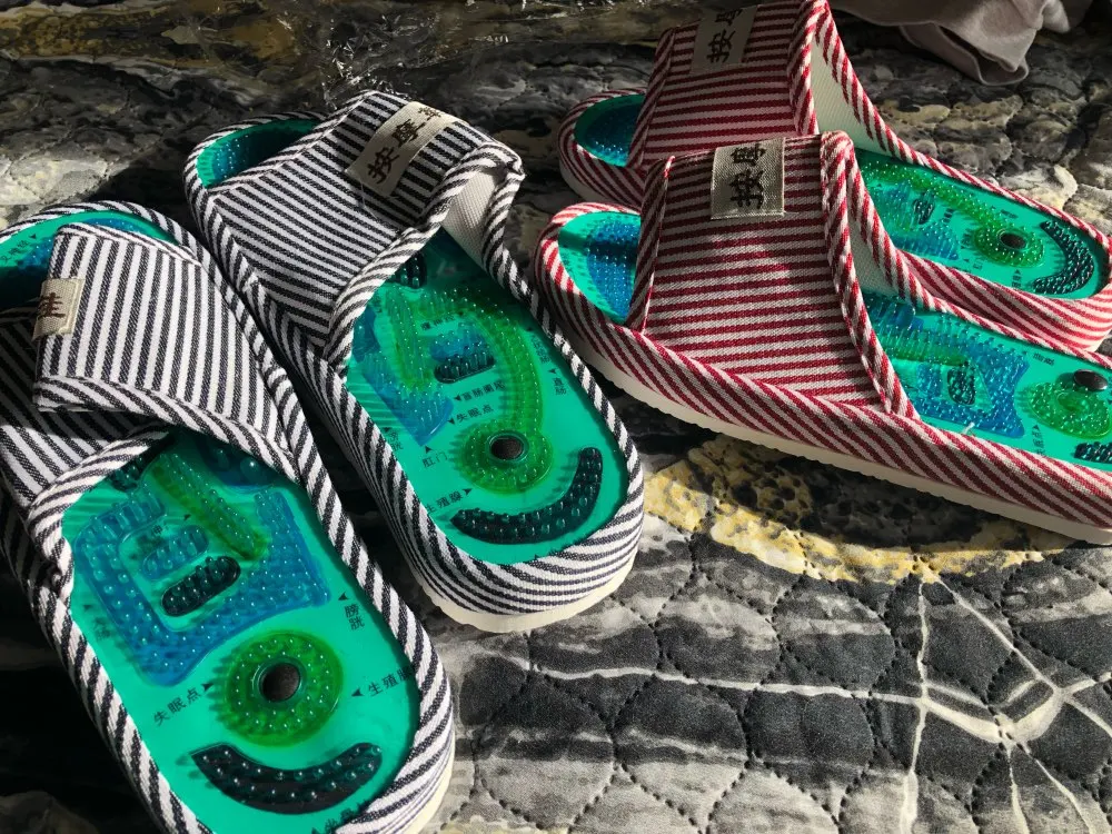 Тапочки, которые обеспечивают акупунктурный массаж в точечных центрах ног. Как в описании. Они прибыли в ближайшее время и хорошо защищены. И это розы. Спасибо, мистер продавец.