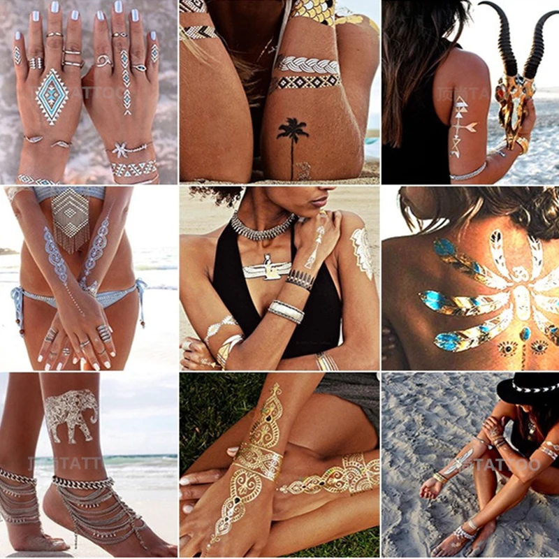 Металлическая водостойкая временная татуировка, золотистогосеребристого цвета, Женская Татуировка хны в стиле бохо, стикер для татуировки со стрелками