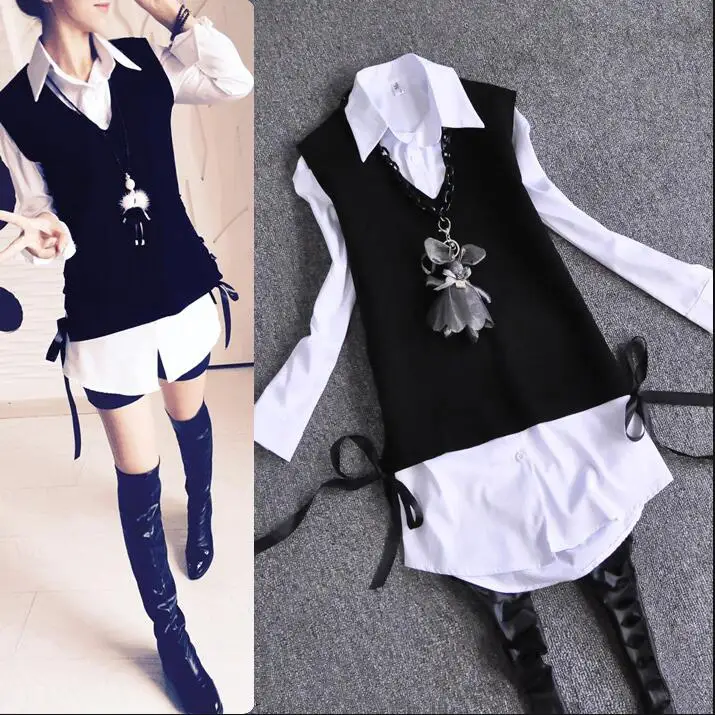 Размера плюс 3XL! Женский комплект из двух предметов, белая рубашка с длинным рукавом и вязаный жилет, весна-осень