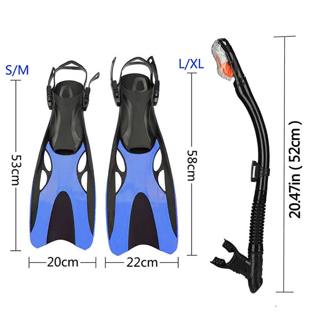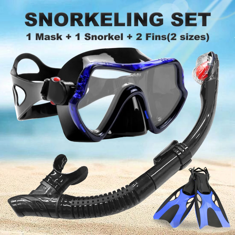 Этот набор для снорклинга включает в себя пару очков, трубку и пару плавников.