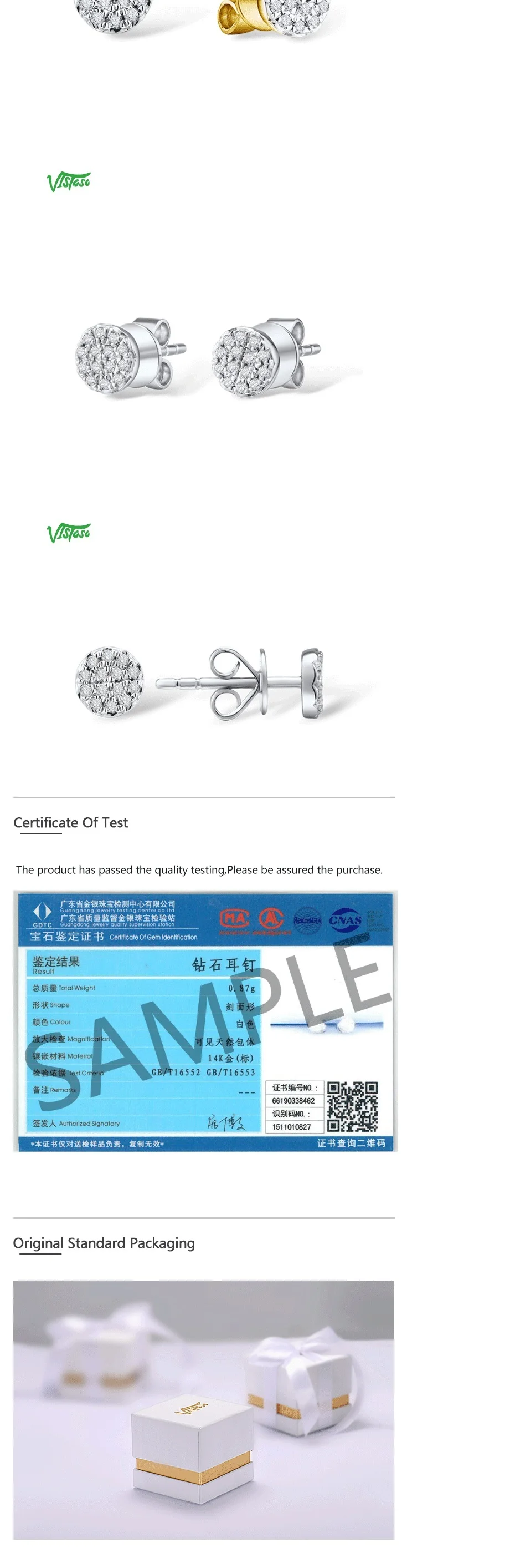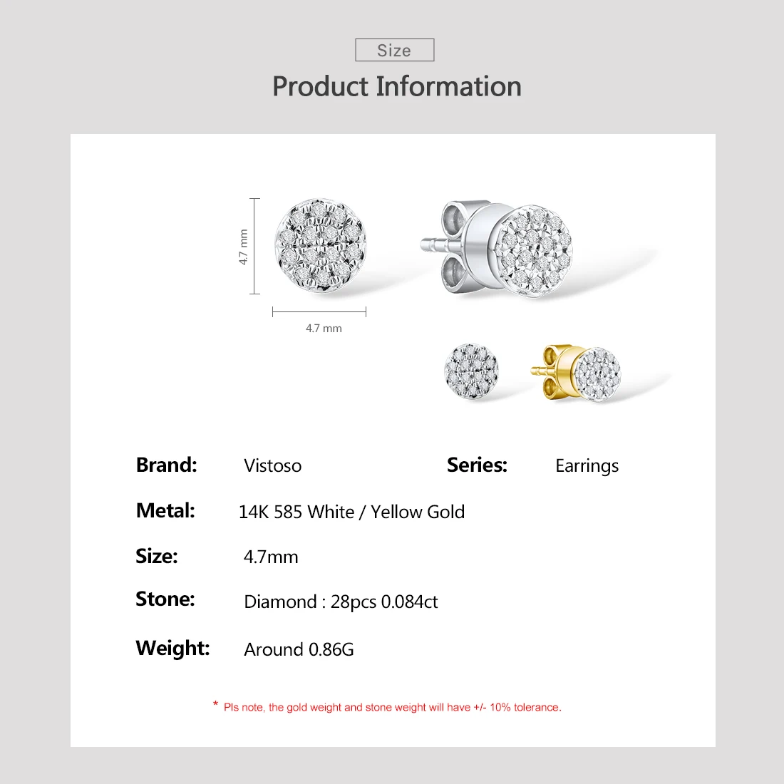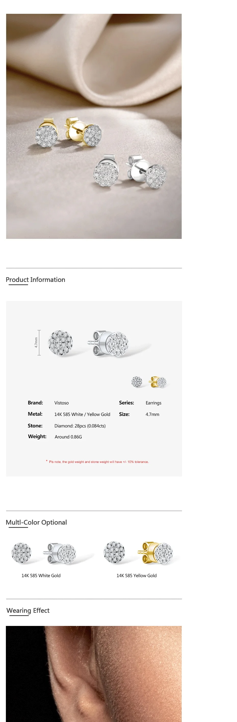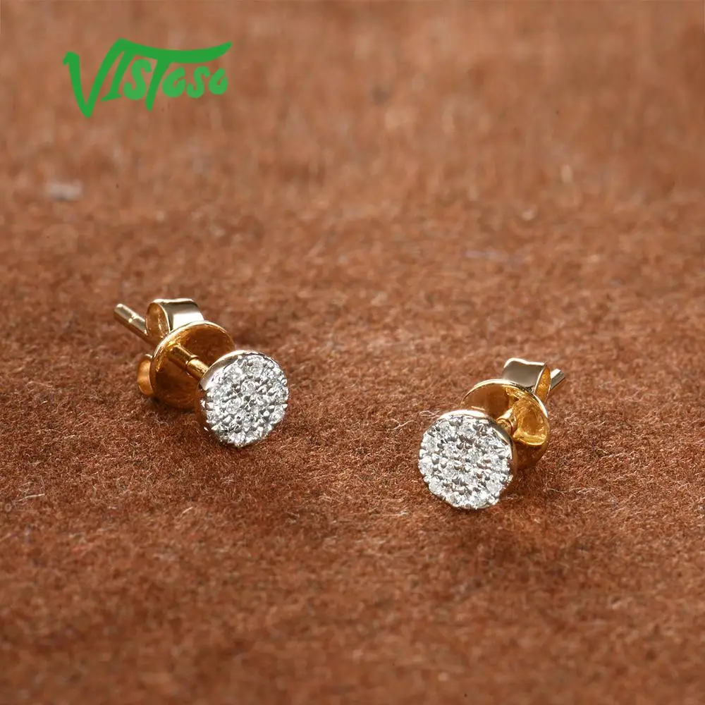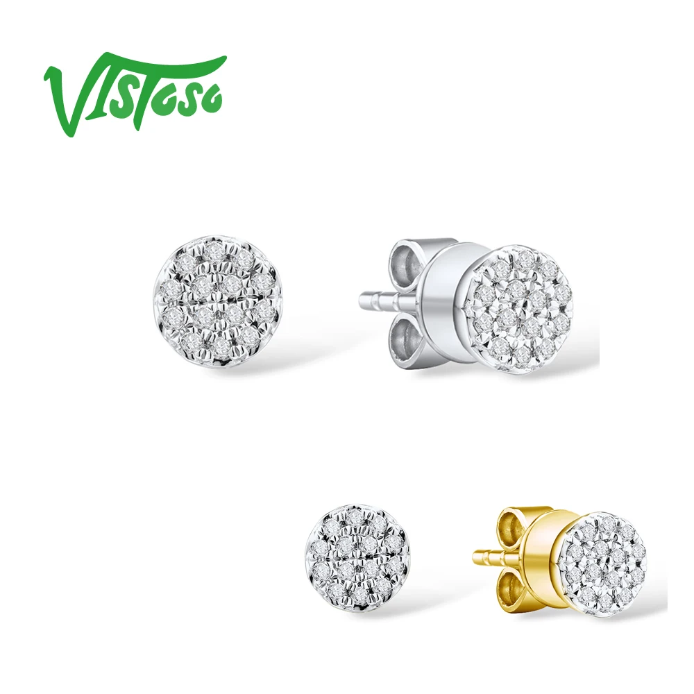 Женские золотые серьги VISTOSO, 14 к, 585 Желтоебелое золото, сверкающие бриллианты, изящные круглые трендовые серьги-гвоздики, ювелирные украшения