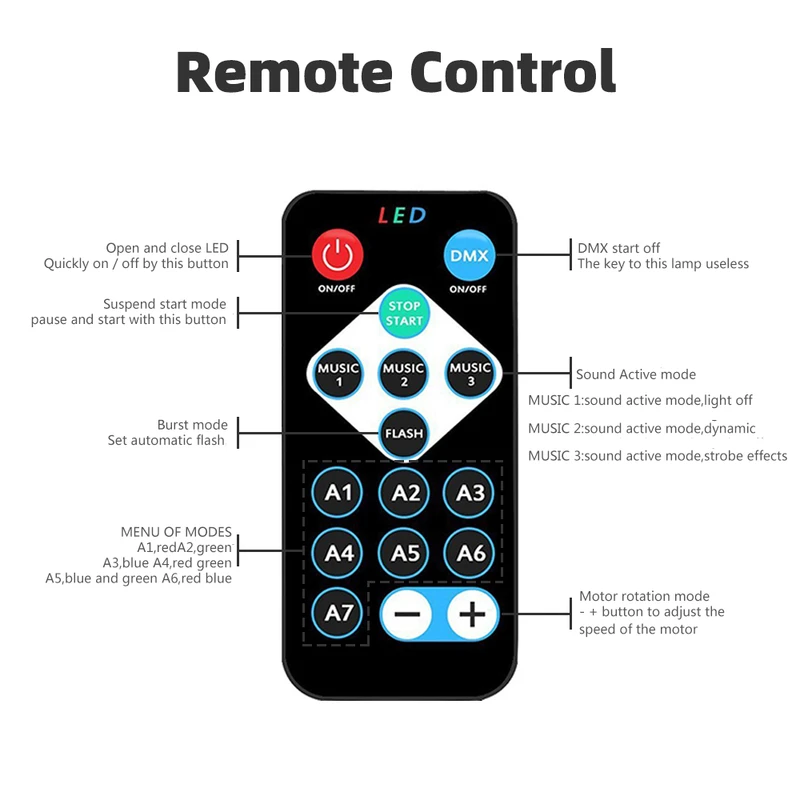 1. Семь цветов вращают дискотечную лампу: (красный, зеленый, синий, красный/зеленый, красный/синий, зеленый/синий или все цвета вместе). Легко выбрать однотонный или многоцветный с помощью пульта дистанционного управления чувствительностью. Полностью регулируемая скорость движения.