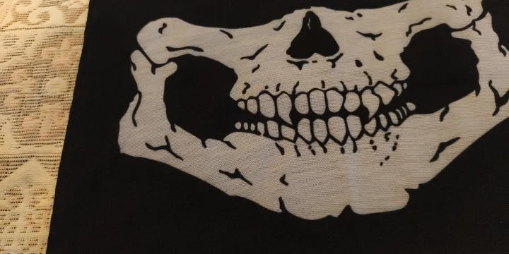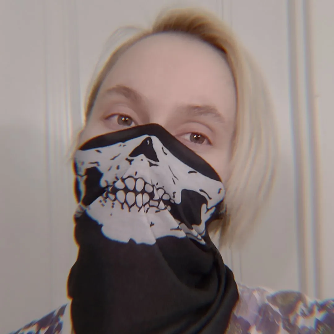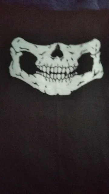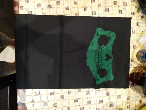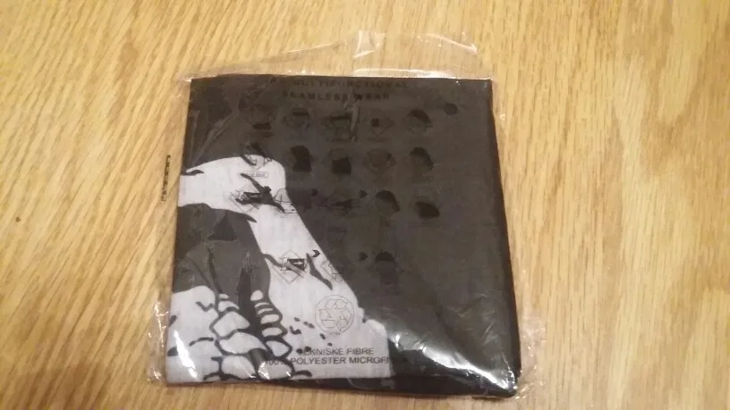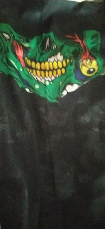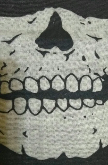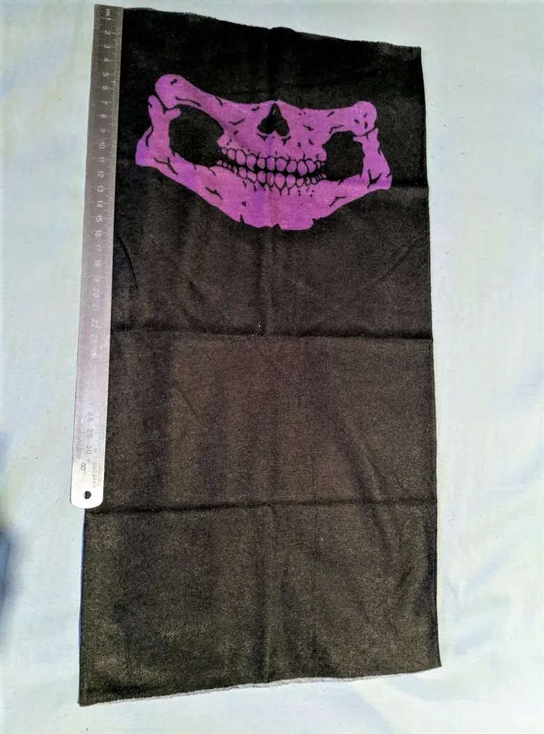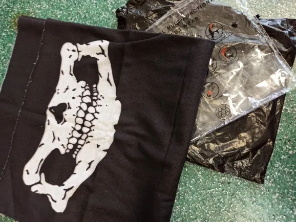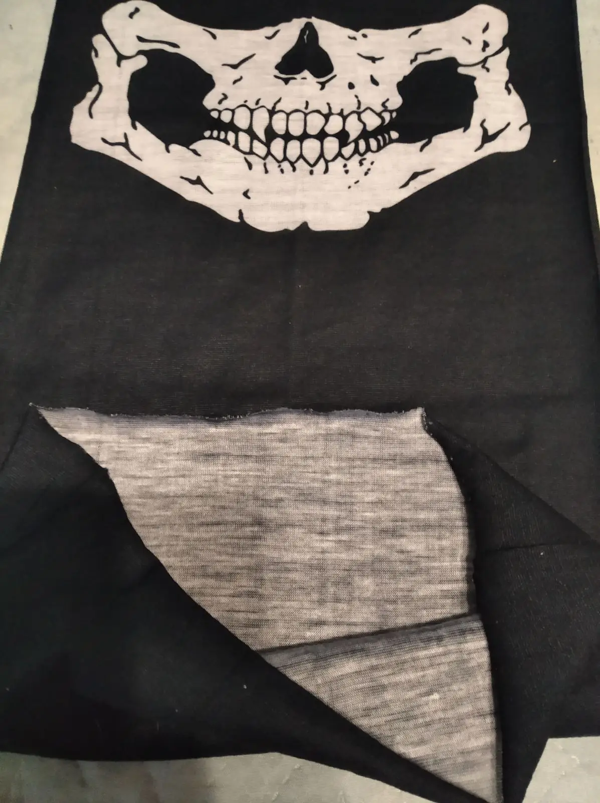 Синтетическая труба без шва, с необметанными краями. Принт только с одной стороны. Окружность головы 55 см: сваливается. С шапкой нормально. + Можно носить и череп, и сплошную черную сторону, два в одном. - Принт начинается посередине трубы, а не у верхнего края, запаришься подворачивать (см фото).