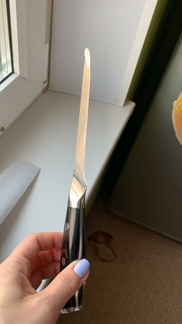 Упаковка отличная. Сам нож заточен хорошо, бумагу режет легко и ровно, волосы на руке не с лёгкостью, но сбривает. Режущая кромка по ширине с левой стороны больше. Мясо не разделывал пока, разделал рыбу, порезал другие продукты. Режет не супер-агрессивно, но похоже, что соответственно твёрдости металла 1.4116 (он же Х50СrMoV15), где-то 54-56HRC. Производитель на клинке написал - 58HRC. Гибкость клинка ожидал чуть большую из-за ширины лезвия, но, может, и этой хватит для более комфортной разделки, обвалки той же курицы. Ручка тяжёленькая, баланс ножа – на фото. Вес 157 г. Пока что я доволен ножом. Спасибо!