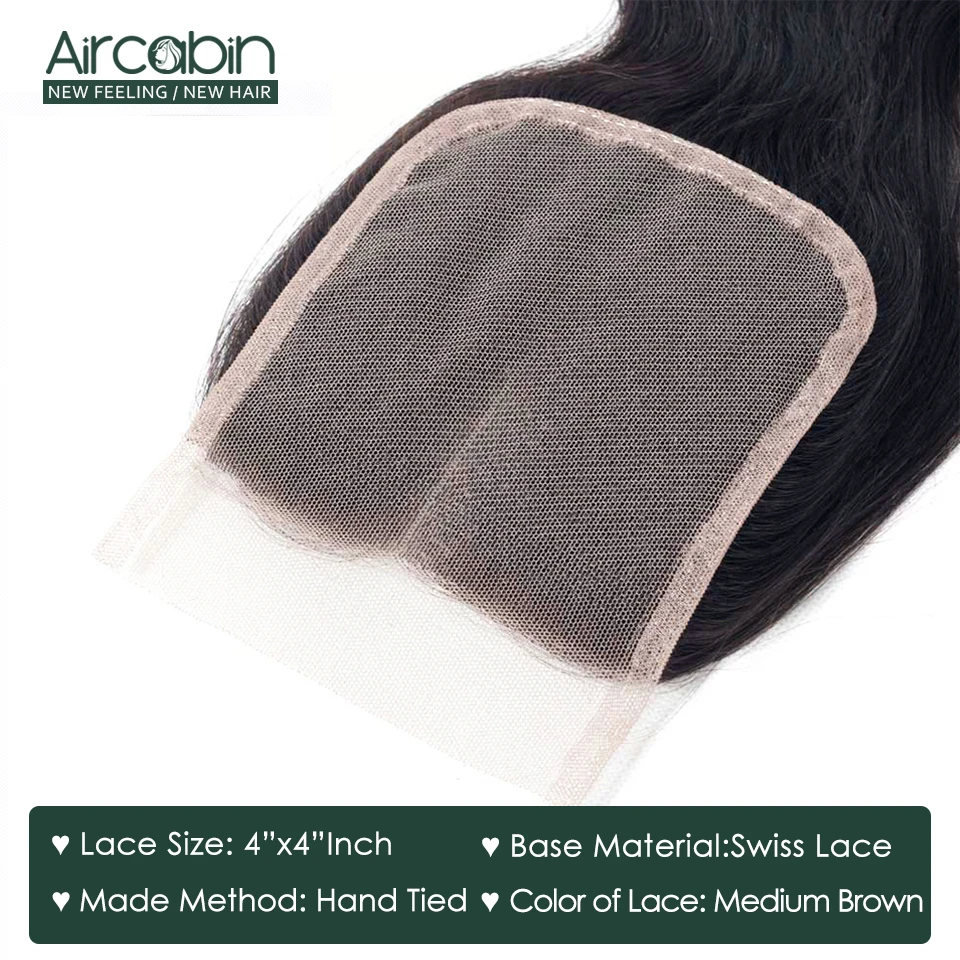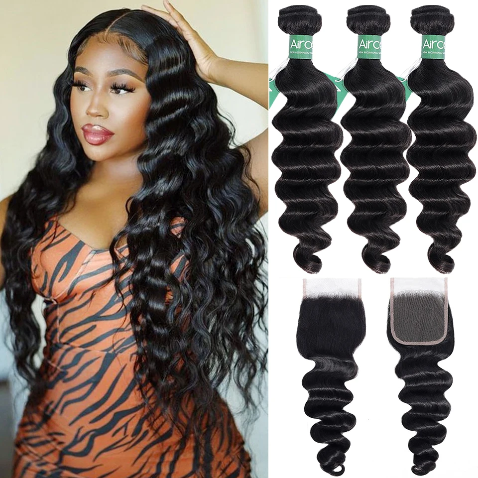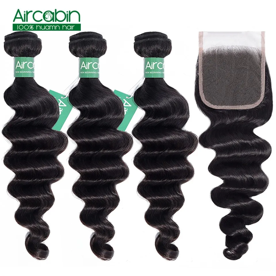Aircabin свободные глубокая волна пряди с закрытием бразильские Remy пряди натуральные кудрявые пучки волос пряди с закрытием кружева 34 пряди с закрытием