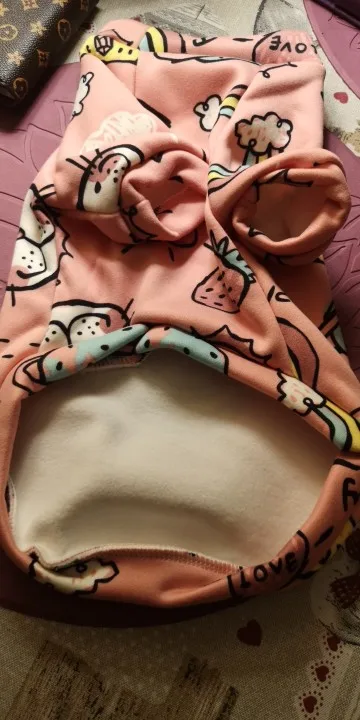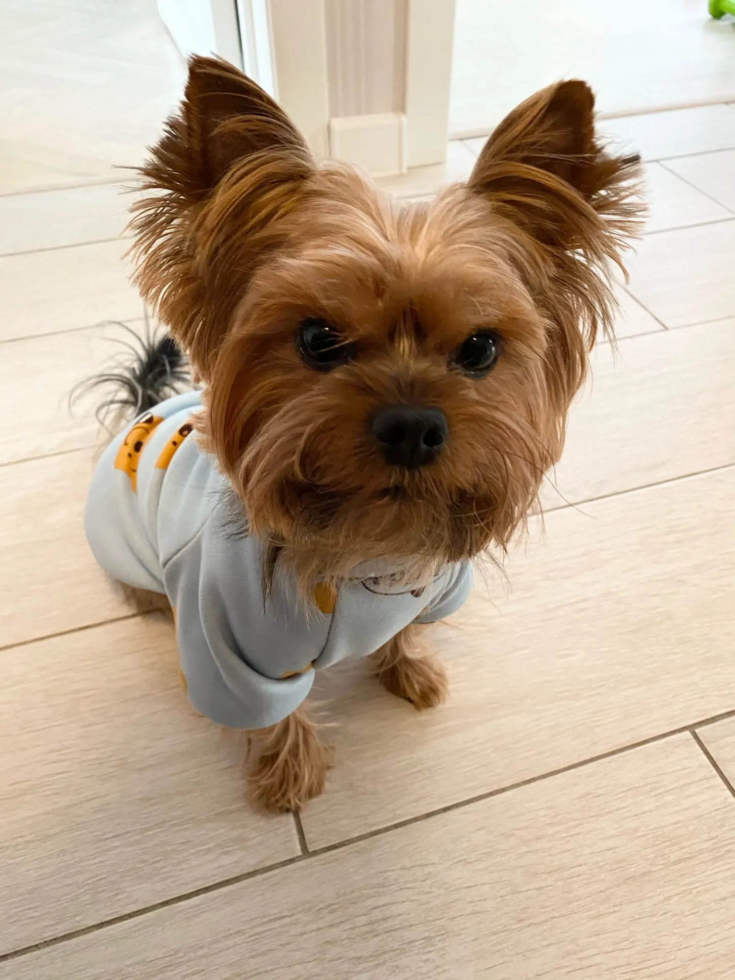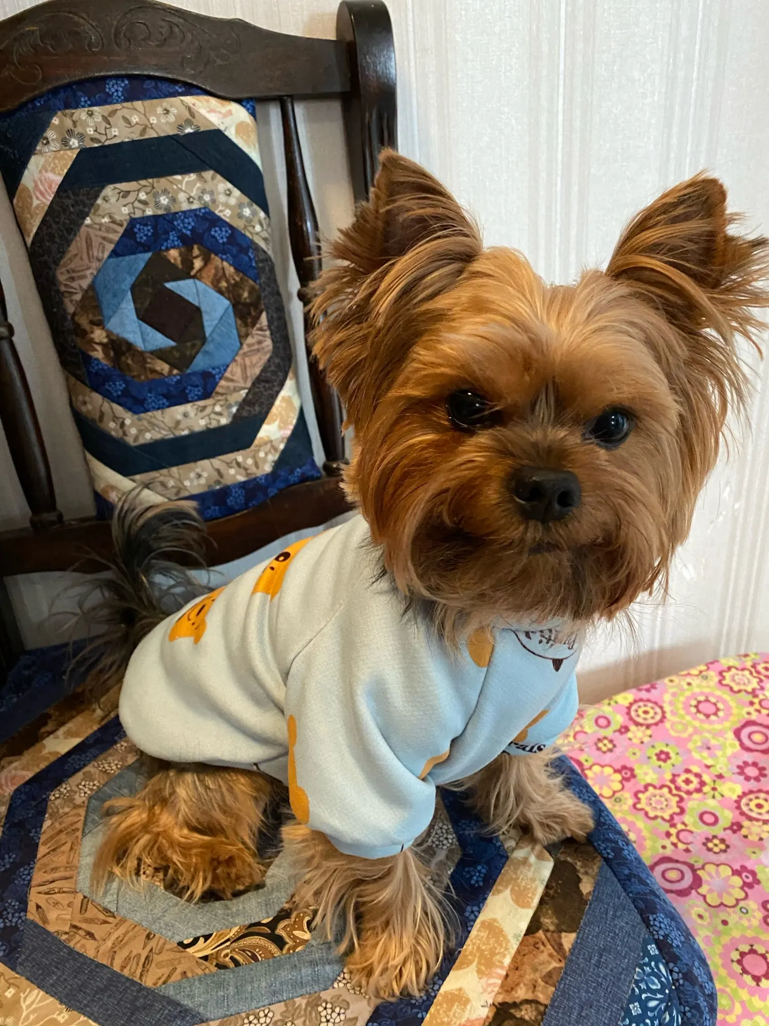 очень хорошая толстовка из толстой искуственно й байки. Точно по размеру, сверяли с таблицей. шея и передние лапы прикрыты. только немного широковат рукав, иногда лапа выскакивает в ворот, когда лежит. На йорка 2.8 кг размер 14. Сшито очень аккуратно.