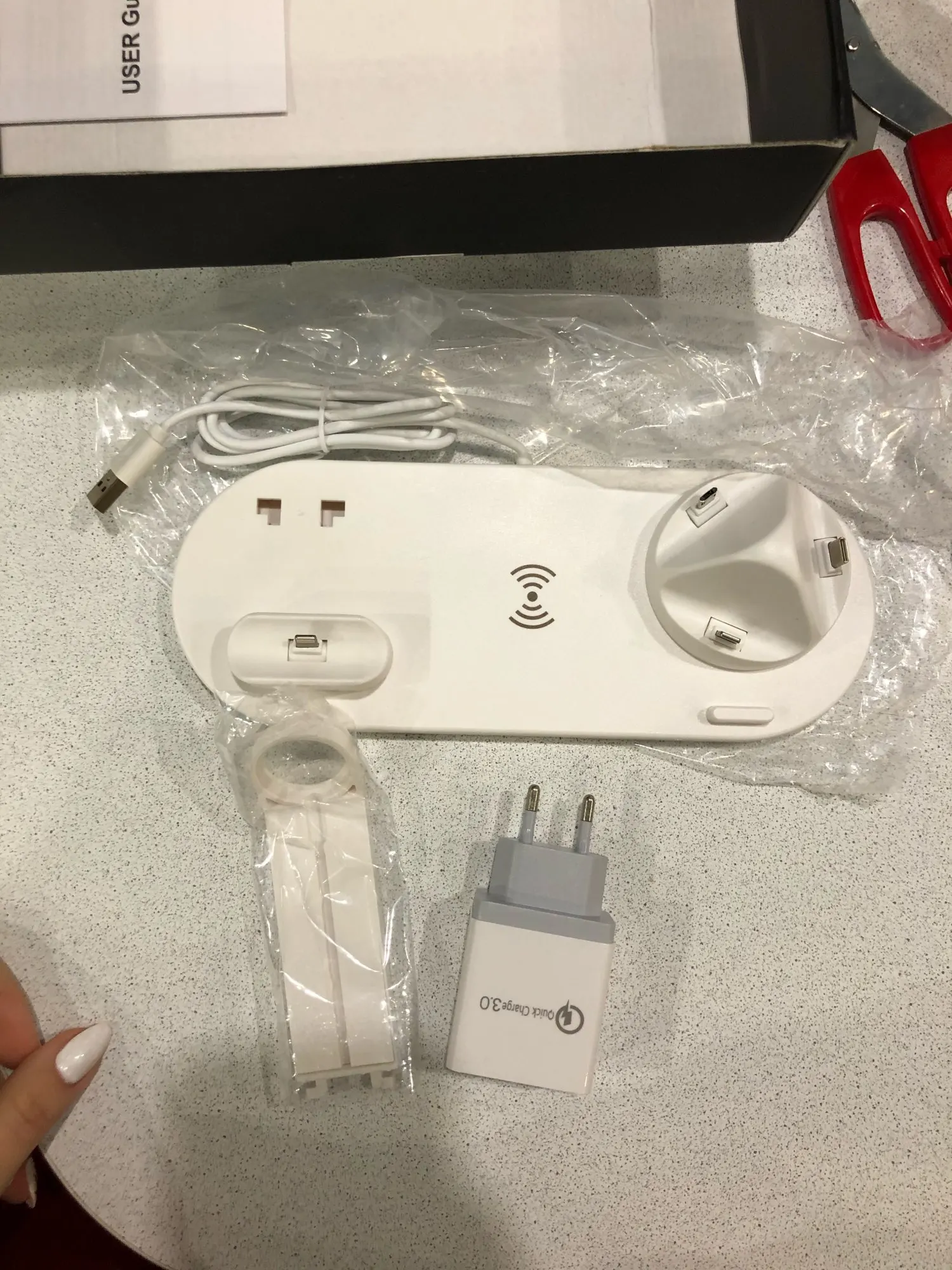 зарядка просто супер, упакована была тоже очень хорошо.. одну звезду все же сняла за то что штекеры под зарядку наушников и дополнительных аксессуаров шевелятся будто хлипкие, хотя по идее не выпадают... работают все места ни каких дефектов нет на зарядке, так же портативная зарядка для часов тоже очень порадовала... вилка пока не понадобилась, но тоже работает... сам товар пришёл очень быстро, даже быстрее чем было написано... рекомендую товар и продавца!!