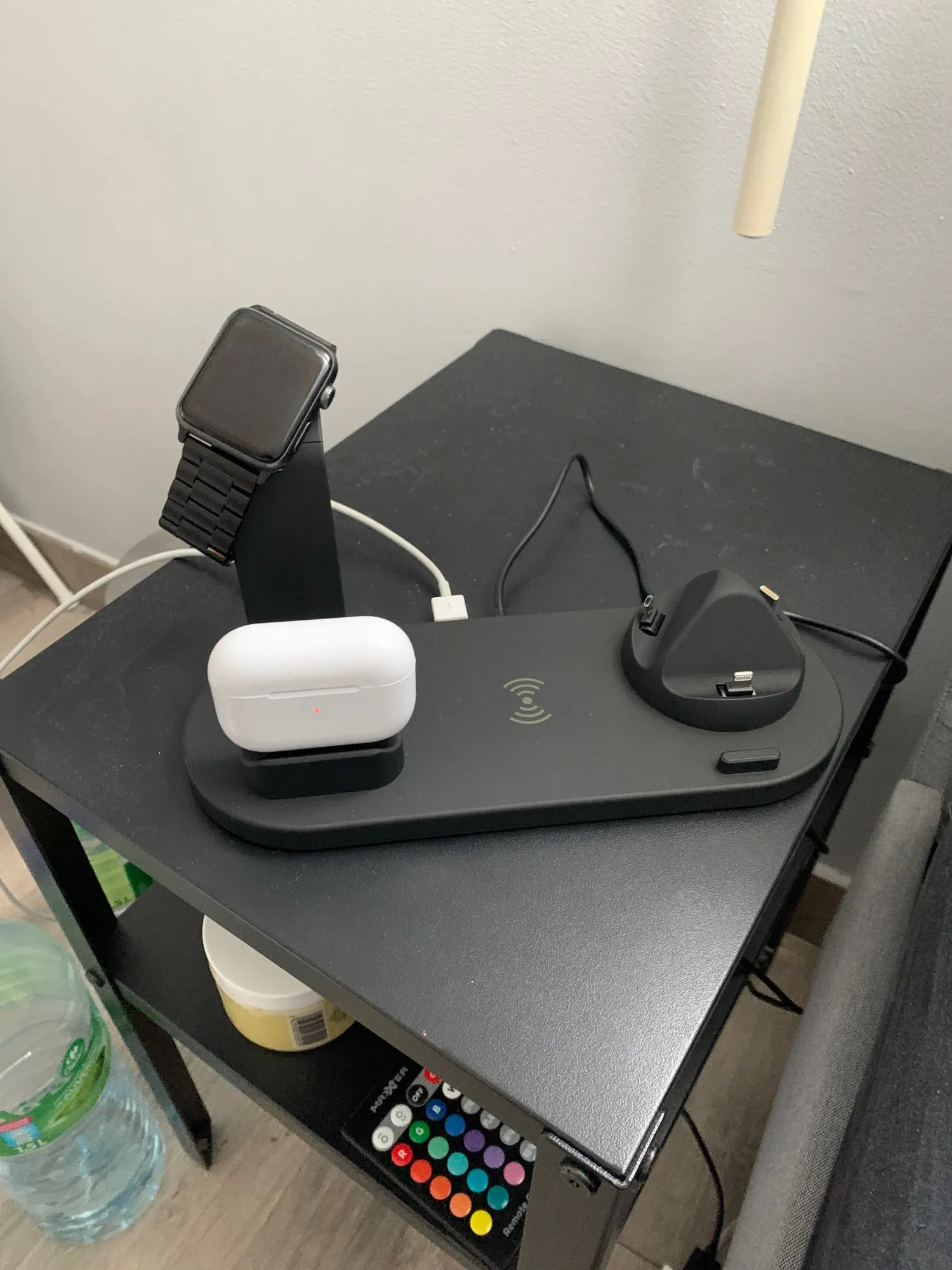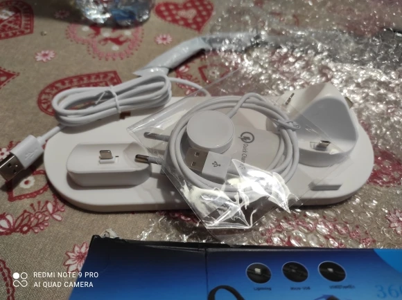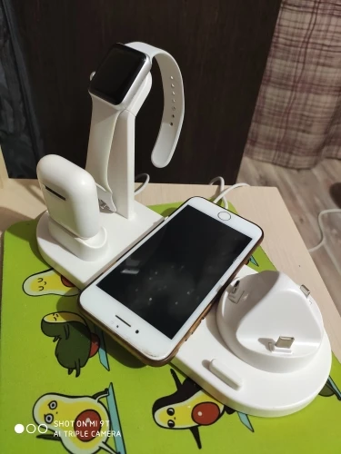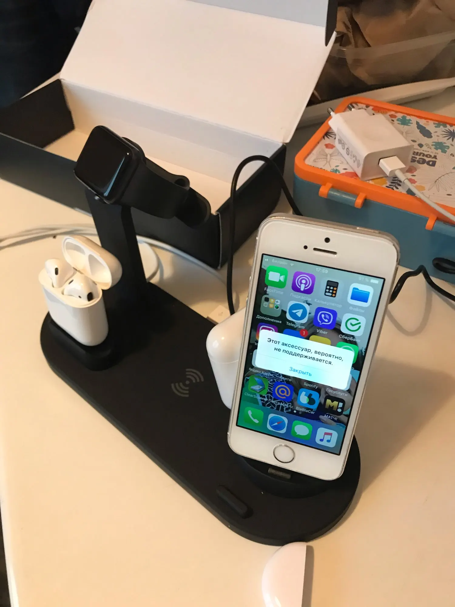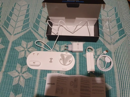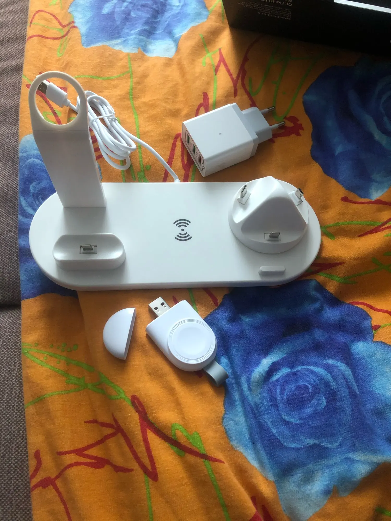 Всё работает, доставка на удивление быстрая, да и продавец быстро отправил. Очень удобная штука. Единственное с подставкой под часы какая то проблема-иногда теряет контакт, но потом находит и в итоге за ночь заряжает. Ещё было сложно установить эту самую подставку (нужно приложить силу, но и умудриться не сломать). Сама зарядка под часы была в комплекте, что порадовало. Наушники заряжаются беспроводным способом, все элементы работают.