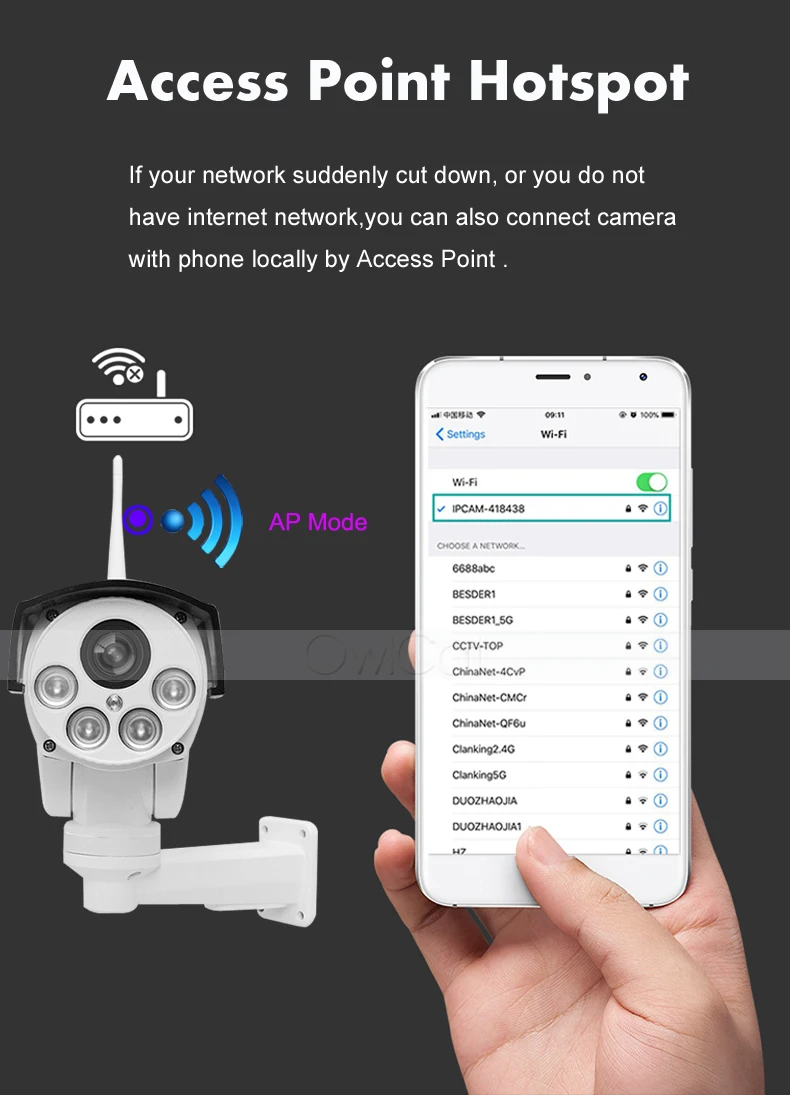 Поддержка подключения точки доступа/точки доступа, вы можете подключить смартфон к камере с помощью режима AP и прямого просмотра/воспроизведения/управления панорамированием наклона даже без интернета рядом